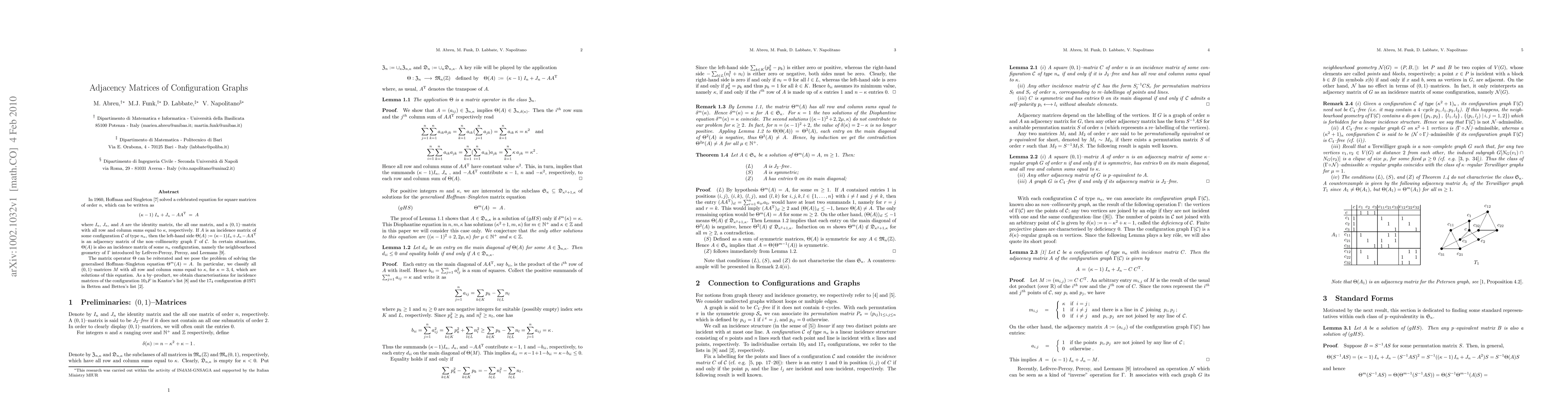 In 1960, Hoffman and Singleton \cite{HS60} solved a celebrated equation for square matrices of order $n$, which can be written as $$ (\kappa - 1) I_n + J_n - A A^{\rm T} = A$$ where $I_n$, $J_n$, and $A$ are the identity matrix, the all one matrix, and a $(0,1)$--matrix with all row and column sums equal to $\kappa$, respectively. If $A$ is an incidence matrix of some configuration $\cal C$ of type $n_\kappa$, then the left-hand side $\Theta(A):= (\kappa - 1)I_n + J_n - A A^{\rm T}$ is an adjacency matrix of the non--collinearity graph $\Gamma$ of $\cal C$. In certain situations, $\Theta(A)$ is also an incidence matrix of some $n_\kappa$ configuration, namely the neighbourhood geometry of $\Gamma$ introduced by Lef\`evre-Percsy, Percsy, and Leemans \cite{LPPL}. The matrix operator $\Theta$ can be reiterated and we pose the problem of solving the generalised Hoffman--Singleton equation $\Theta^m(A)=A$. In particular, we classify all $(0,1)$--matrices $M$ with all row and column sums equal to $\kappa$, for $\kappa = 3,4$, which are solutions of this equation. As a by--product, we obtain characterisations for incidence matrices of the configuration $10_3F$ in Kantor's list \cite{Kantor} and the $17_4$ configuration $#1971$ in Betten and Betten's list \cite{BB99}.