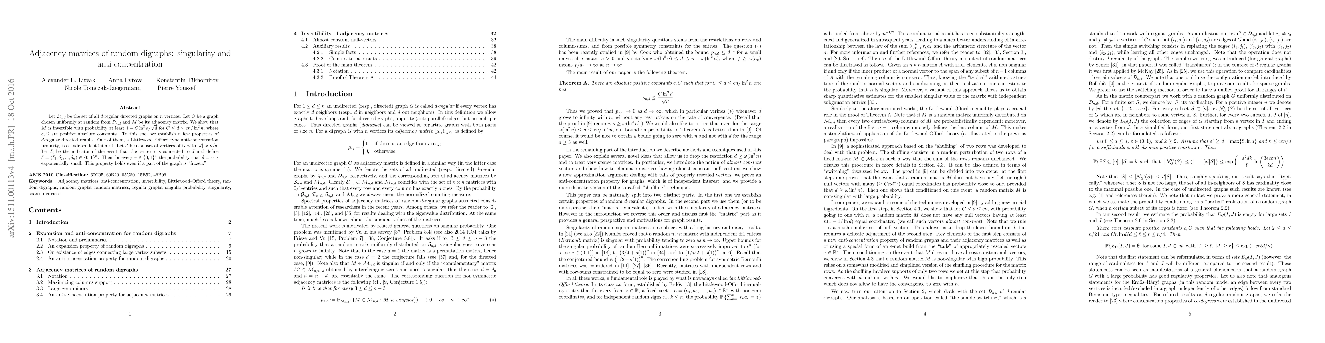 Let ${\mathcal D}_{n,d}$ be the set of all $d$-regular directed graphs on $n$ vertices. Let $G$ be a graph chosen uniformly at random from ${\mathcal D}_{n,d}$ and $M$ be its adjacency matrix. We show that $M$ is invertible with probability at least $1-C\ln^{3} d/\sqrt{d}$ for $C\leq d\leq cn/\ln^2 n$, where $c, C$ are positive absolute constants. To this end, we establish a few properties of $d$-regular directed graphs. One of them, a Littlewood-Offord type anti-concentration property, is of independent interest. Let $J$ be a subset of vertices of $G$ with $|J|\approx n/d$. Let $\delta_i$ be the indicator of the event that the vertex $i$ is connected to $J$ and define $\delta = (\delta_1, \delta_2, ..., \delta_n)\in \{0, 1\}^n$. Then for every $v\in\{0,1\}^n$ the probability that $\delta=v$ is exponentially small. This property holds even if a part of the graph is "frozen".