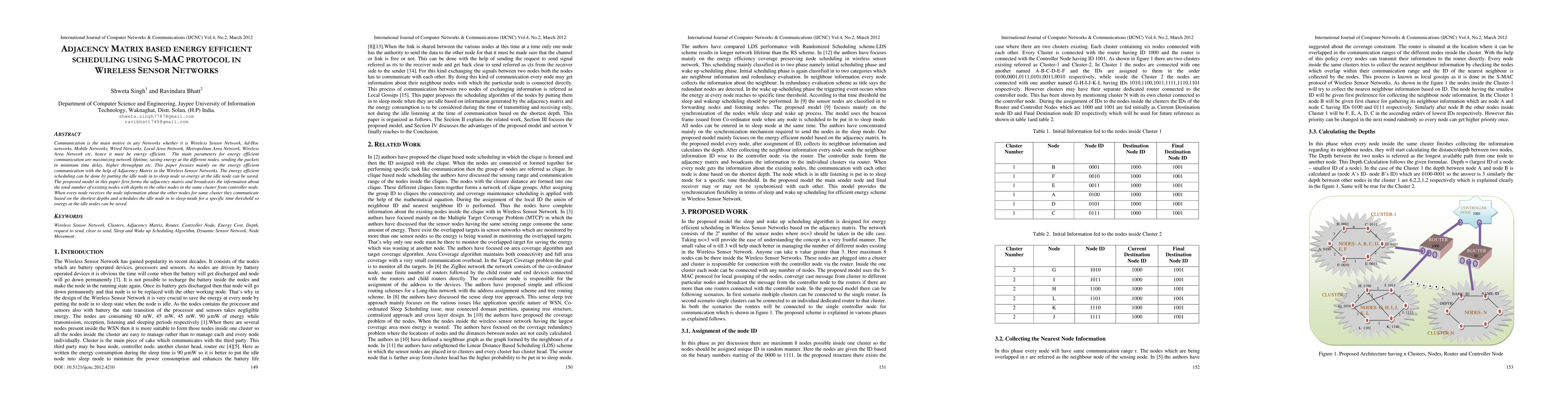 Communication is the main motive in any Networks whether it is Wireless Sensor Network, Ad-Hoc networks, Mobile Networks, Wired Networks, Local Area Network, Metropolitan Area Network, Wireless Area Network etc, hence it must be energy efficient. The main parameters for energy efficient communication are maximizing network lifetime, saving energy at the different nodes, sending the packets in minimum time delay, higher throughput etc. This paper focuses mainly on the energy efficient communication with the help of Adjacency Matrix in the Wireless Sensor Networks. The energy efficient scheduling can be done by putting the idle node in to sleep node so energy at the idle node can be saved. The proposed model in this paper first forms the adjacency matrix and broadcasts the information about the total number of existing nodes with depths to the other nodes in the same cluster from controller node. When every node receives the node information about the other nodes for same cluster they communicate based on the shortest depths and schedules the idle node in to sleep mode for a specific time threshold so energy at the idle nodes can be saved.