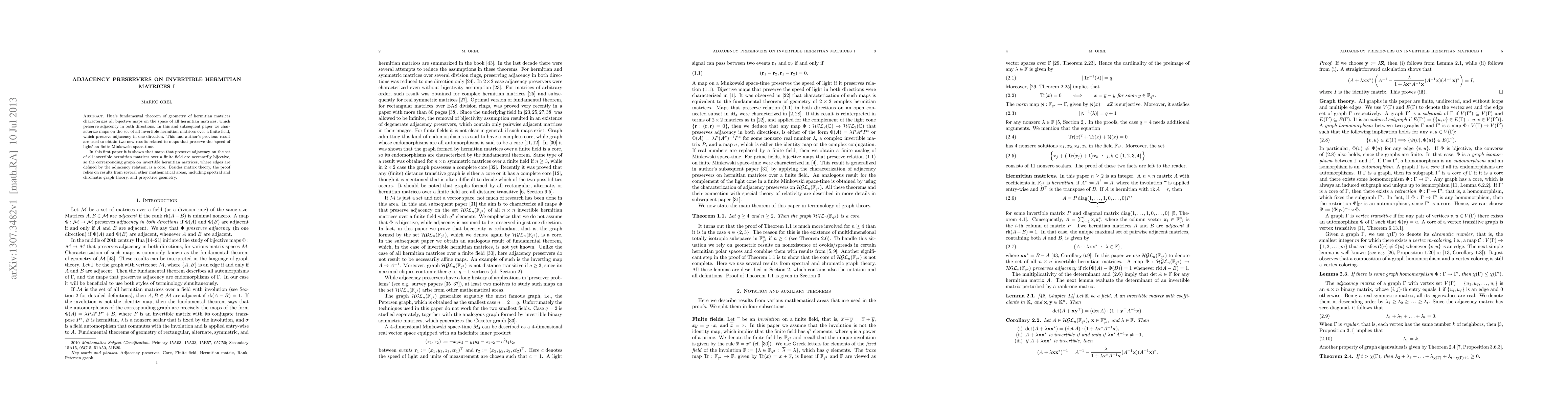 This paper characterizes bijective maps on invertible hermitian matrices over a finite field that preserve adjacency in one direction. It demonstrates that such maps must be bijective, establishing the adjacency relation's graph as a core, and utilizes results from matrix theory, spectral and chromatic graph theory, and projective geometry.