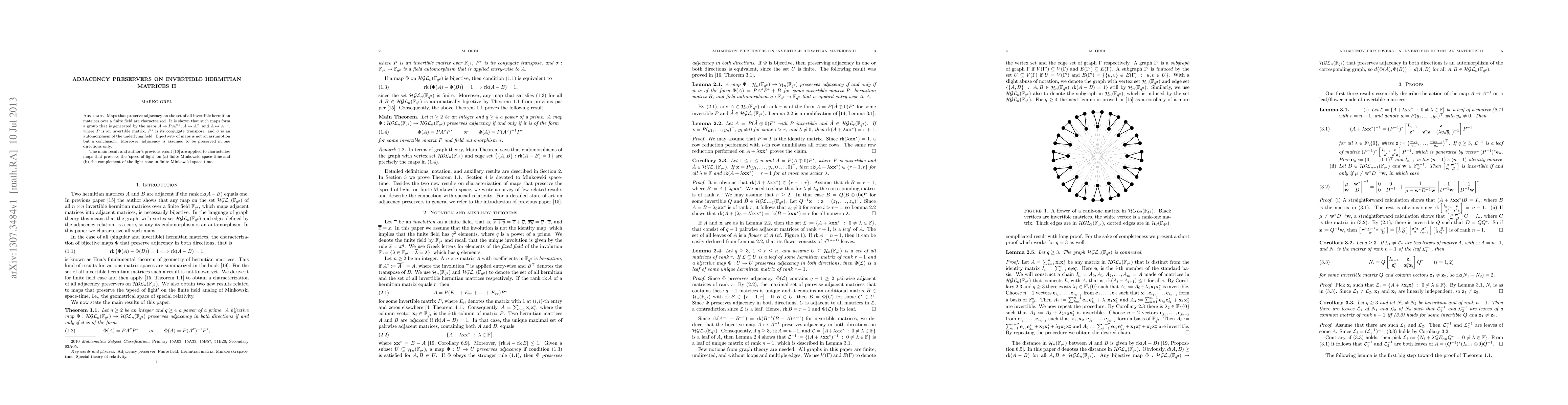 This paper characterizes maps preserving adjacency on invertible hermitian matrices over a finite field, showing they form a group generated by specific transformations. The study extends to characterize maps preserving the "speed of light" in finite Minkowski space-time and its complement.