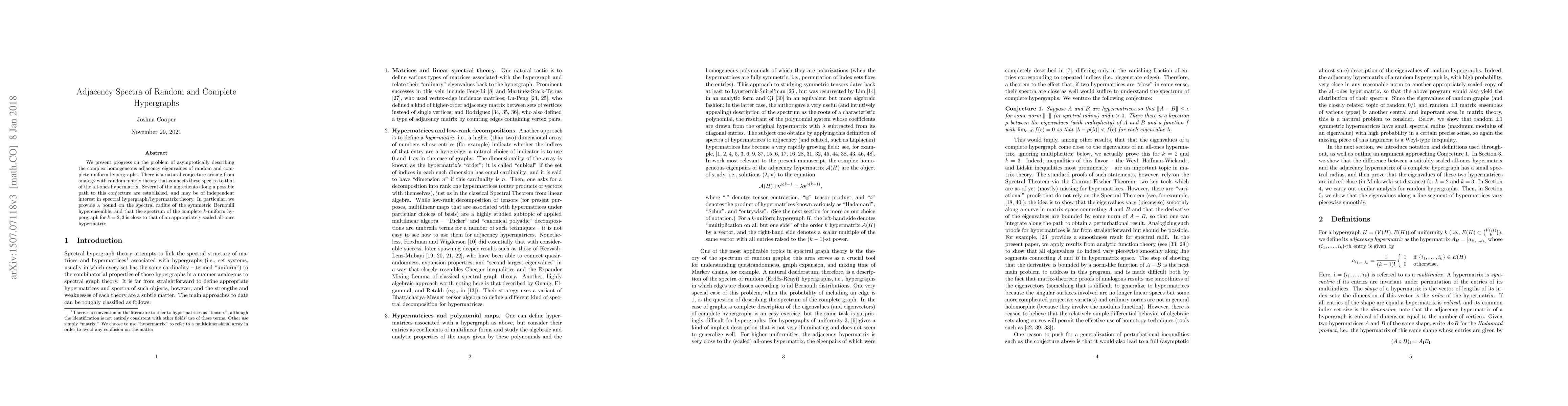 The paper investigates the adjacency spectra of random and complete uniform hypergraphs, establishing connections to random matrix theory and providing bounds on the spectral radius of the symmetric Bernoulli hyperensemble.