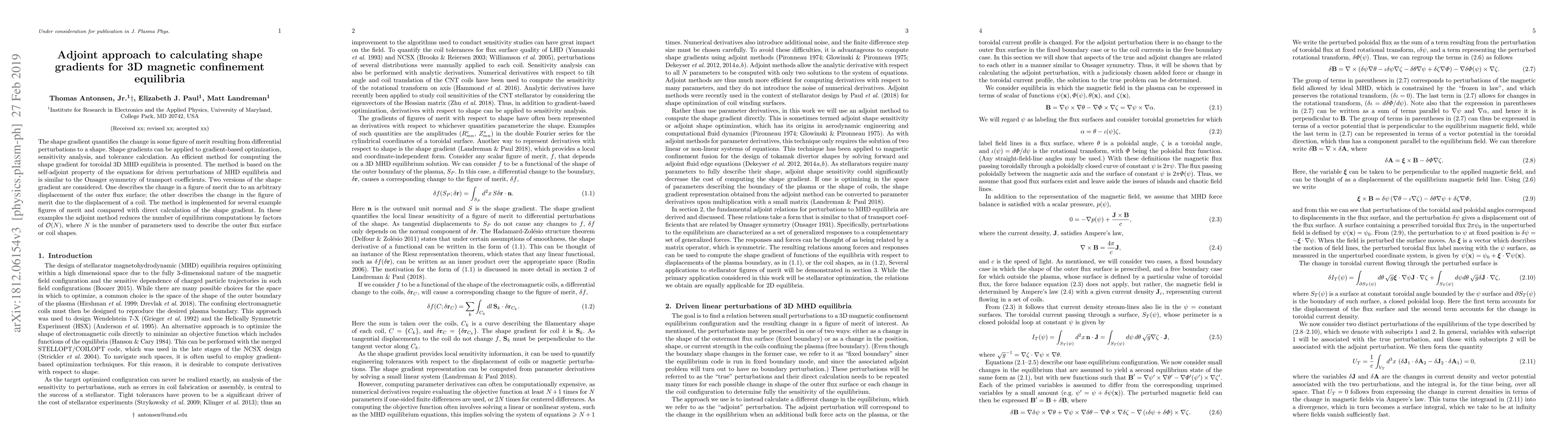 This paper presents an efficient adjoint method for calculating the shape gradient in 3D magnetic confinement equilibria, significantly reducing computational effort compared to direct methods. The method leverages the self-adjoint property of MHD equilibrium equations and is applied to various figures of merit, demonstrating substantial reductions in equilibrium computations.