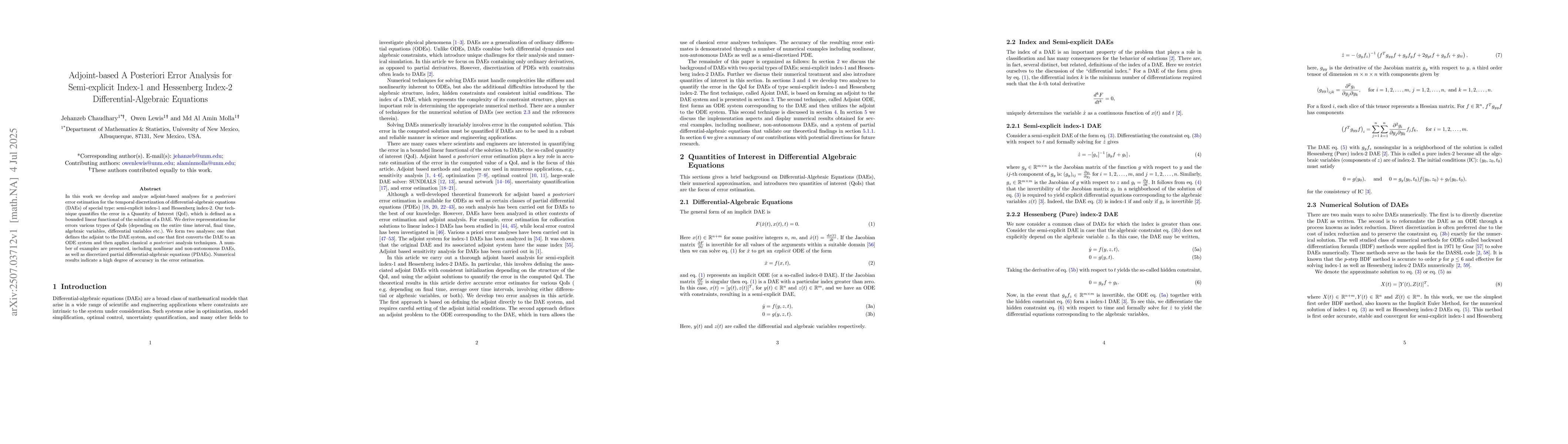 In this work we develop and analyze adjoint-based analyses for \textit{a posteriori} error estimation for the temporal discretization of differential-algebraic equations (DAEs) of special type: semi-explicit index-1 and Hessenberg index-2. Our technique quantifies the error in a Quantity of Interest (QoI), which is defined as a bounded linear functional of the solution of a DAE. We derive representations for errors various trypes of QoIs (depending on the entire time interval, final time, algebraic variables, differential variables etc.). We form two analyses: one that defines the adjoint to the DAE system, and one that first converts the DAE to an ODE system and then applies classical \textit{a posteriori} analysis techniques. A number of examples are presented, including nonlinear and non-autonomous DAEs, as well as discretized partial differential-algebraic equations (PDAEs). Numerical results indicate a high degree of accuracy in the error estimation.