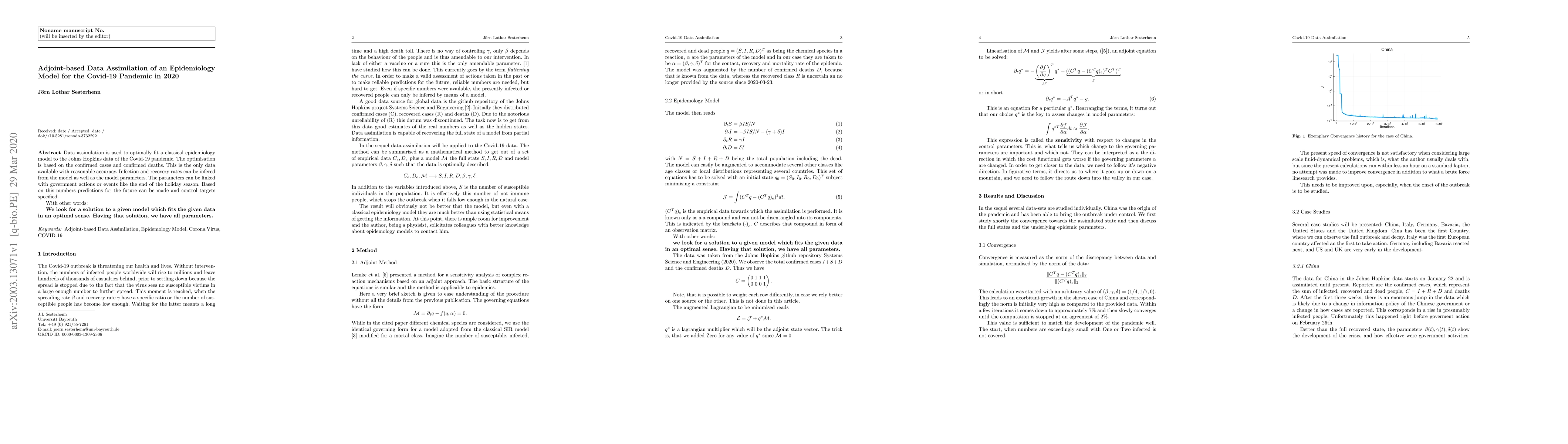Data assimilation is used to optimally fit a classical epidemiology model to the Johns Hopkins data of the Covid-19 pandemic. The optimisation is based on the confirmed cases and confirmed deaths. This is the only data available with reasonable accuracy. Infection and recovery rates can be infered from the model as well as the model parameters. The parameters can be linked with government actions or events like the end of the holiday season. Based on this numbers predictions for the future can be made and control targets specified. With other words: We look for a solution to a given model which fits the given data in an optimal sense. Having that solution, we have all parameters.