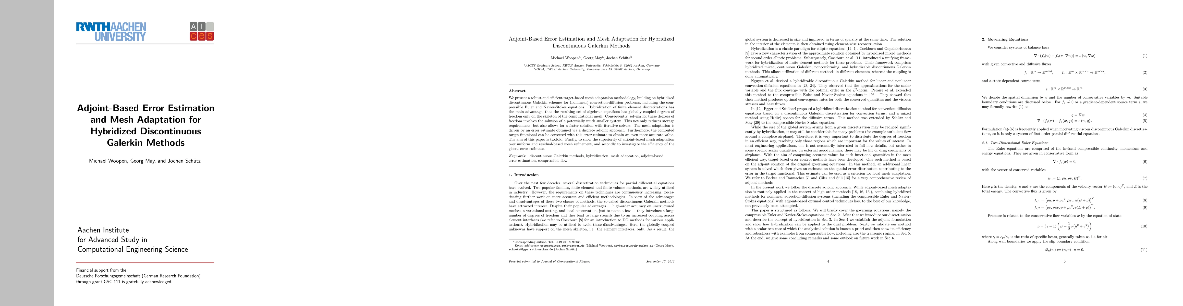 We present a robust and efficient target-based mesh adaptation methodology, building on hybridized discontinuous Galerkin schemes for (nonlinear) convection-diffusion problems, including the compressible Euler and Navier-Stokes equations. Hybridization of finite element discretizations has the main advantage, that the resulting set of algebraic equations has globally coupled degrees of freedom only on the skeleton of the computational mesh. Consequently, solving for these degrees of freedom involves the solution of a potentially much smaller system. This not only reduces storage requirements, but also allows for a faster solution with iterative solvers. The mesh adaptation is driven by an error estimate obtained via a discrete adjoint approach. Furthermore, the computed target functional can be corrected with this error estimate to obtain an even more accurate value. The aim of this paper is twofold: Firstly, to show the superiority of adjoint-based mesh adaptation over uniform and residual-based mesh refinement, and secondly to investigate the efficiency of the global error estimate.