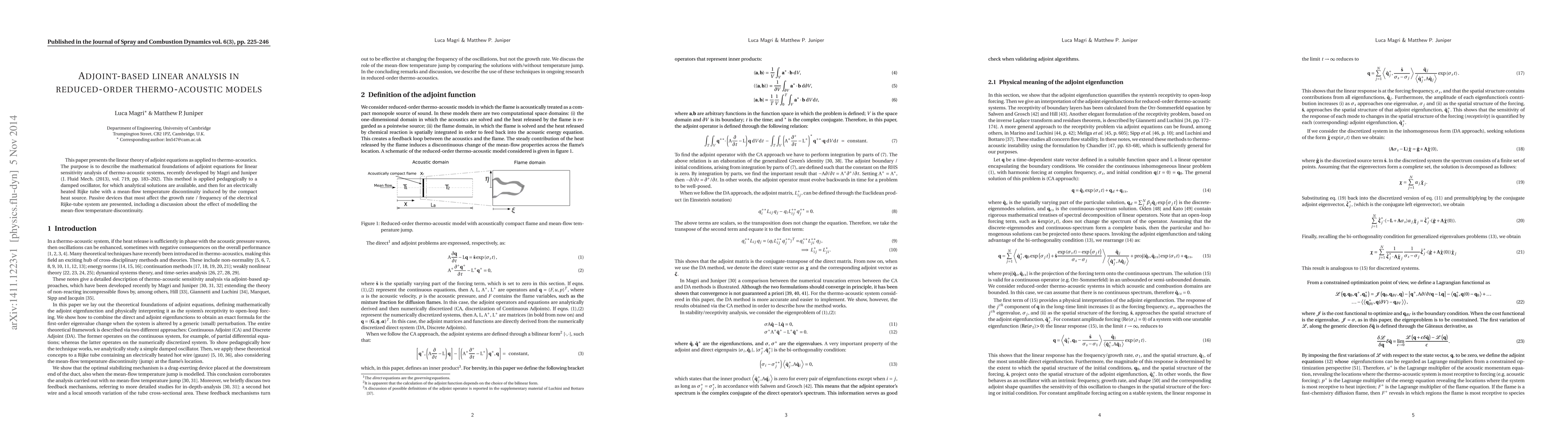 This paper presents the linear theory of adjoint equations as applied to thermo-acoustics. The purpose is to describe the mathematical foundations of adjoint equations for linear sensitivity analysis of thermo-acoustic systems, recently developed by Magri and Juniper (J. Fluid Mech. (2013), vol. 719, pp. 183--202). This method is applied pedagogically to a damped oscillator, for which analytical solutions are available, and then for an electrically heated Rijke tube with a mean-flow temperature discontinuity induced by the compact heat source. Passive devices that most affect the growth rate / frequency of the electrical Rijke-tube system are presented, including a discussion about the effect of modelling the mean-flow temperature discontinuity.