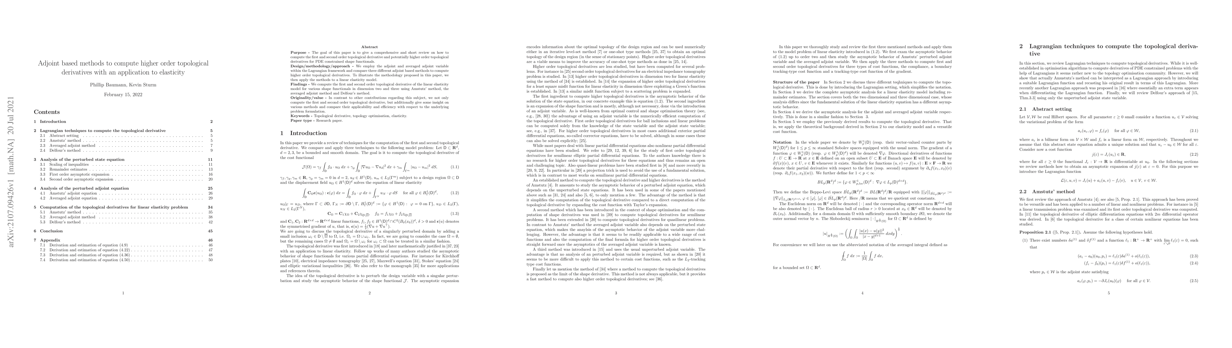 The goal of this paper is to give a comprehensive and short review on how to compute the first and second order topological derivative and potentially higher order topological derivatives for PDE constrained shape functionals. We employ the adjoint and averaged adjoint variable within the Lagrangian framework and compare three different adjoint based methods to compute higher order topological derivatives. To illustrate the methodology proposed in this paper, we then apply the methods to a linear elasticity model. We compute the first and second order topological derivative of the linear elasticity model for various shape functionals in dimension $2$ and $3$ using Amstutz' method, the averaged adjoint method and Delfour's method. In contrast to other contributions regarding this subject, we not only compute the first and second order topological derivative, but additionally give some insight on various methods and compared their applicability and efficiency with respect to the underlying problem formulation.