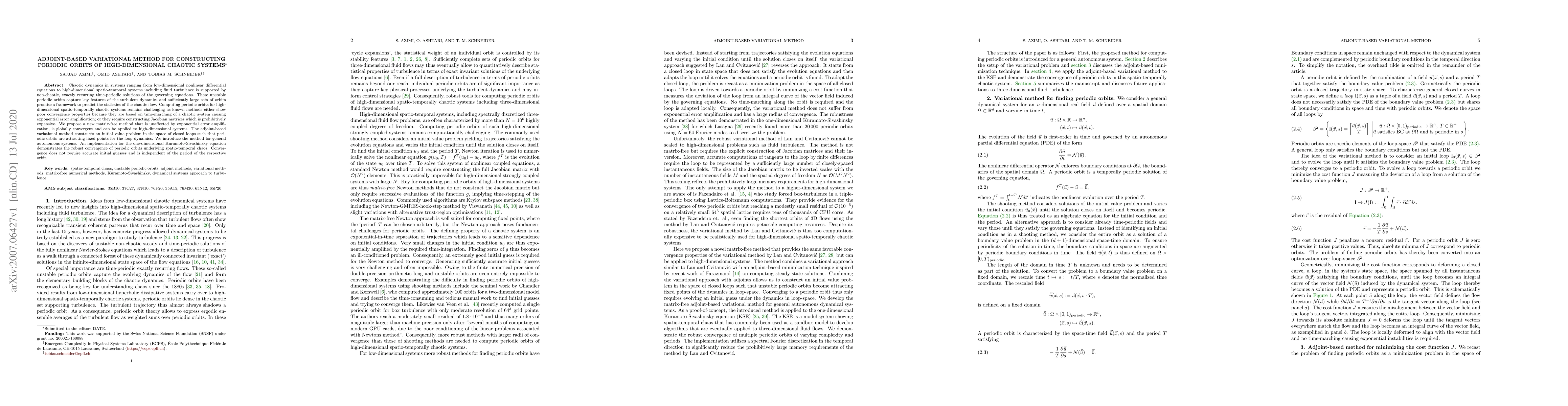 This paper proposes an adjoint-based variational method for finding periodic orbits in high-dimensional chaotic systems, overcoming issues of error amplification and computational expense. The method is globally convergent and demonstrated to robustly compute periodic orbits in the Kuramoto-Sivashinsky equation, showing independence from initial guesses and orbit periods.