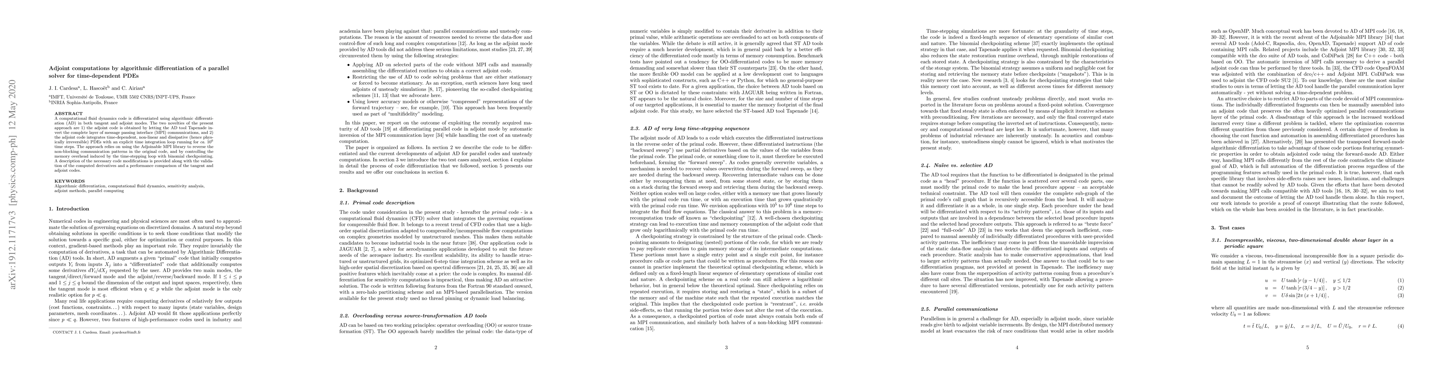 This paper presents an algorithmic differentiation approach to compute adjoints for a parallel solver of time-dependent PDEs, utilizing Tapenade to invert MPI communications and employing Adjoinable MPI and binomial checkpointing to manage memory overhead. Validation and performance comparisons of the tangent and adjoint codes are provided.