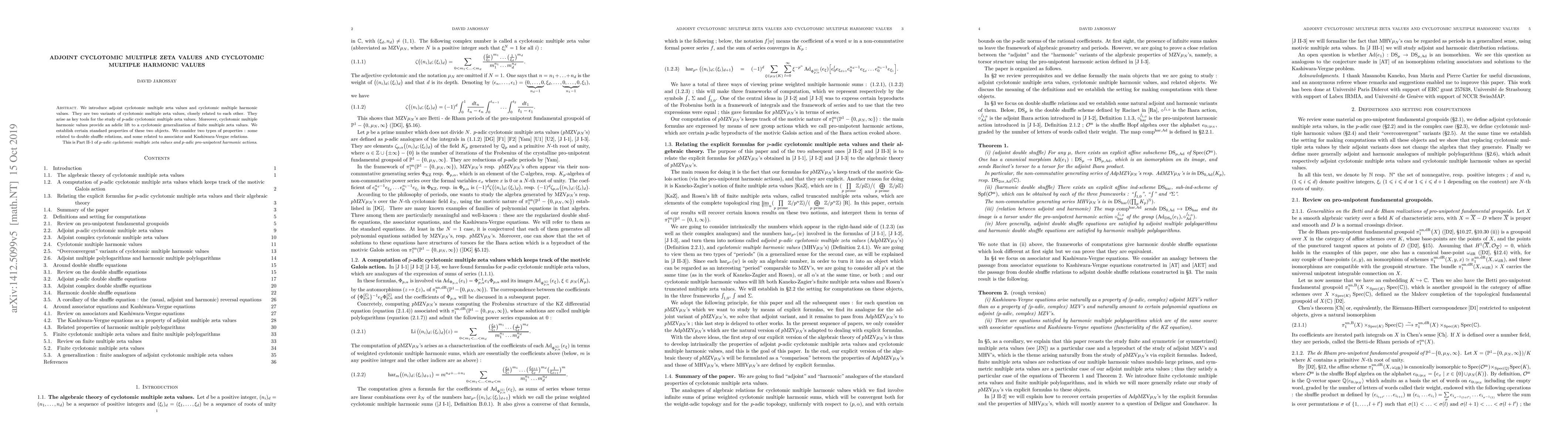 Summary: This paper introduces adjoint cyclotomic multiple zeta values and cyclotomic multiple harmonic values, providing standard properties and connections to $p$-adic cyclotomic multiple zeta values, as well as adelic lifts to finite multiple zeta values, and discusses their relations to double shuffle and associator/Kashiwara-Vergne relations.