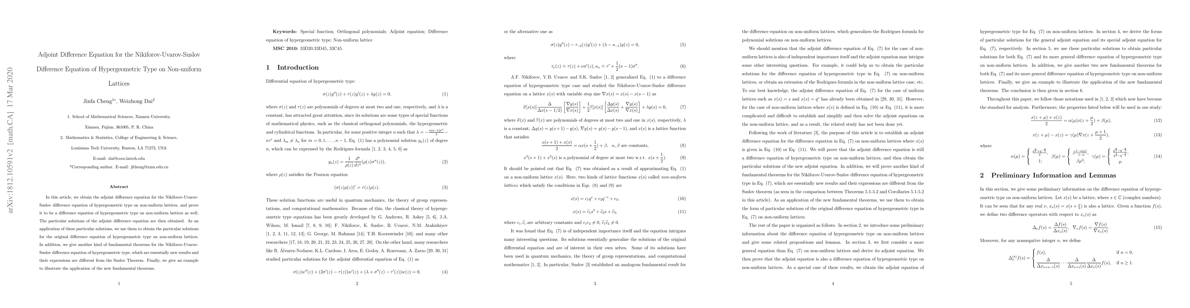 This paper establishes the adjoint difference equation for a Nikiforov-Uvarov-Suslov difference equation on non-uniform lattices, proving it maintains hypergeometric properties. Particular solutions to the adjoint equation are derived and used to find solutions for the original equation, introducing new fundamental theorems distinct from Suslov's Theorem.