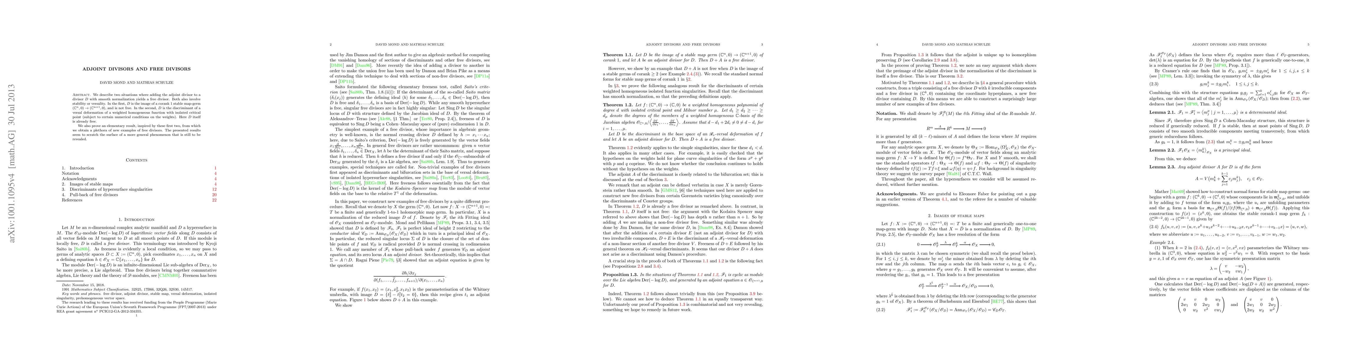 We describe two situations where adding the adjoint divisor to a divisor D with smooth normalization yields a free divisor. Both also involve stability or versality. In the first, D is the image of a corank one stable germ of a map from complex n-space to complex (n+1)-space, and is not free. In the second, D is the discriminant of a versal deformation of a weighted homogeneous function with isolated critical point (subject to certain numerical conditions on the weights). Here D itself is already free. We also prove an elementary result, inspired by these first two, from which we obtain a plethora of new examples of free divisors. The presented results seem to scratch the surface of a more general phenomenon that is still to be revealed.