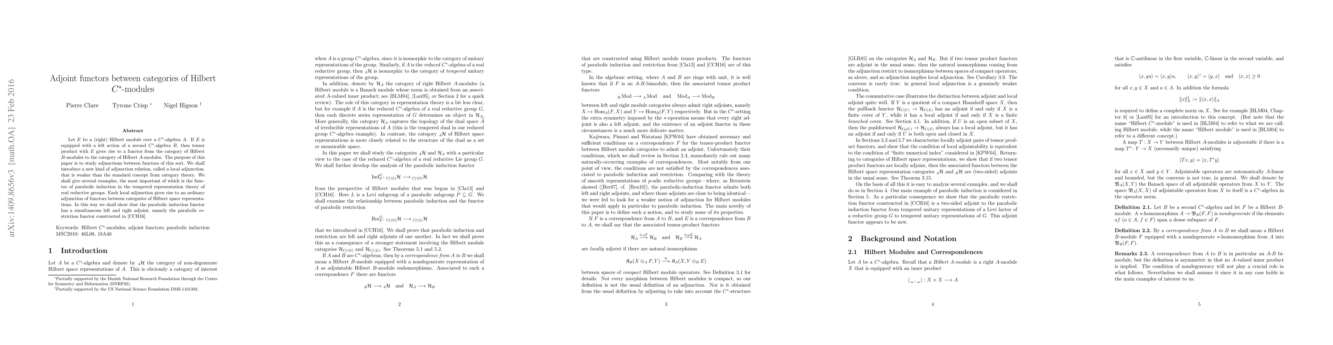 Let E be a (right) Hilbert C*-module over a C*-algebra A. If E is equipped with a left action of a second C*-algebra B, then tensor product with E gives rise to a functor from the category of Hilbert B-modules to the category of Hilbert A-modules. The purpose of this paper is to study adjunctions between functors of this sort. We shall introduce a new kind of adjunction relation, called a local adjunction, that is weaker than the standard concept from category theory. We shall give several examples, the most important of which is the functor of parabolic induction in the tempered representation theory of real reductive groups. Each local adjunction gives rise to an ordinary adjunction of functors between categories of Hilbert space representations. In this way we shall show that the parabolic induction functor has a simultaneous left and right adjoint, namely the parabolic restriction functor constructed in a previous paper.
