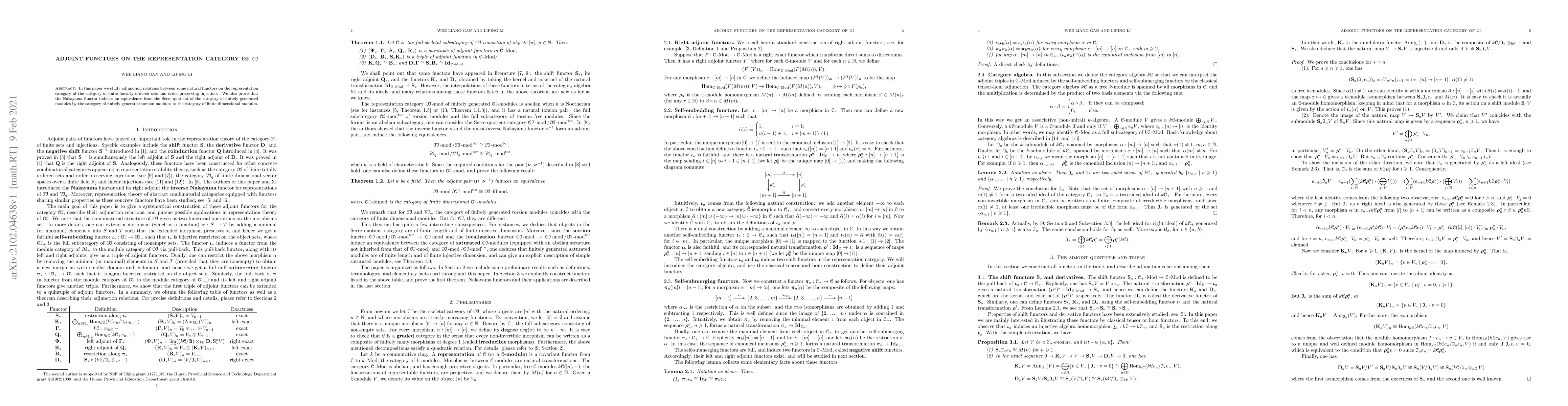 In this paper we study adjunction relations between some natural functors on the representation category of the category of finite linearly ordered sets and order-preserving injections. We also prove that the Nakayama functor induces an equivalence from the Serre quotient of the category of finitely generated modules by the category of finitely generated torsion modules to the category of finite dimensional modules.