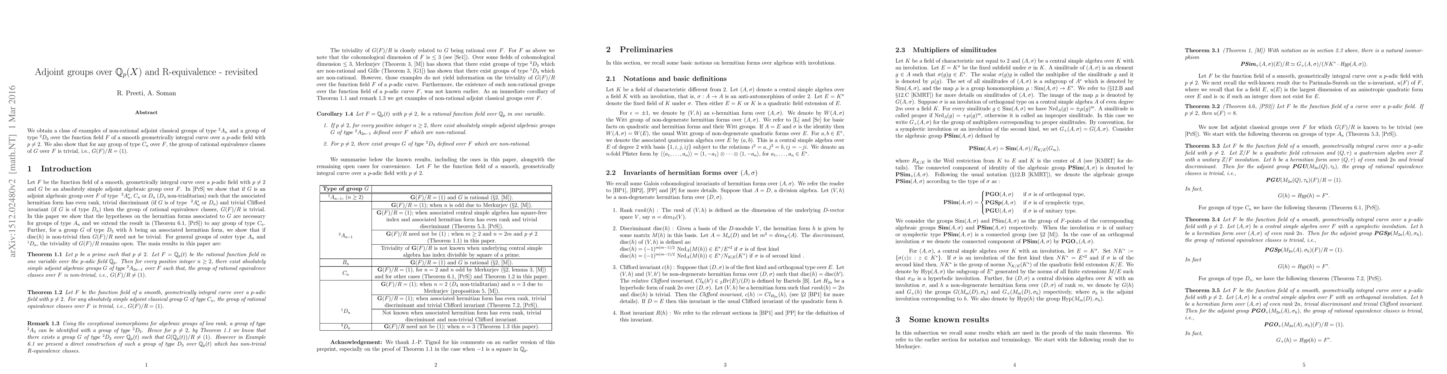 We obtain a class of examples of non-rational adjoint classical groups of type $^2A_n$ and a group of type $^2D_3$ over the function field $F$ of a smooth geometrically integral curve over a $p$-adic field with $p \neq 2$. We also show that for any group of type $C_n$ over $F$, the group of rational equivalence classes of $G$ over $F$ is trivial, i.e., $G(F)/R=(1)$.