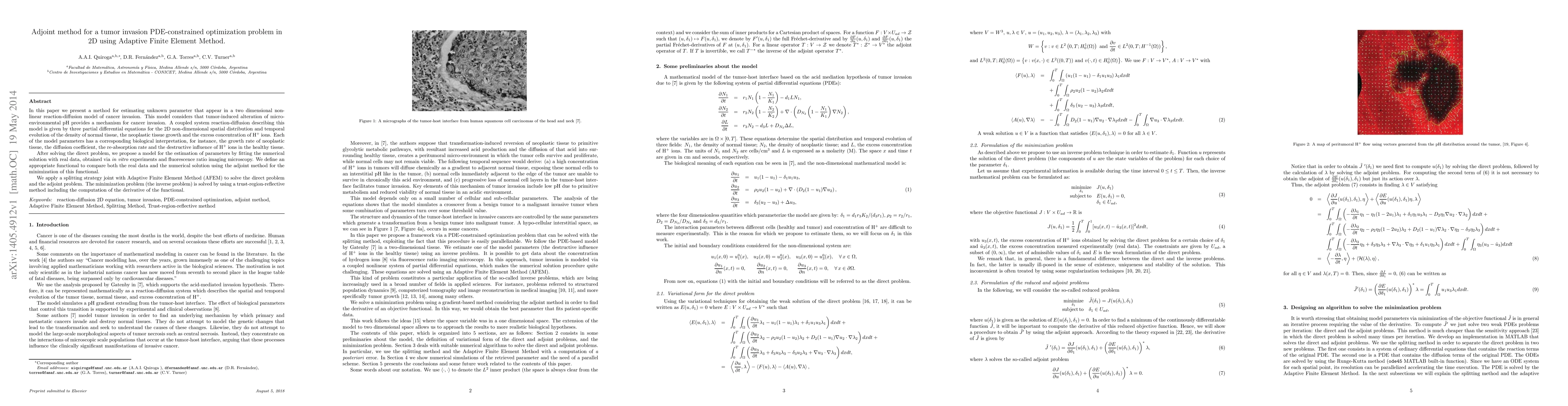 In this paper we present a method for estimating unknown parameter that appear in a two dimensional nonlinear reaction-diffusion model of cancer invasion. This model considers that tumor-induced alteration of microenvironmental pH provides a mechanism for cancer invasion. A coupled system reaction-diffusion describing this model is given by three partial differential equations for the 2D non-dimensional spatial distribution and temporal evolution of the density of normal tissue, the neoplastic tissue growth and the excess concentration of H+ ions. Each of the model parameters has a corresponding biological interpretation, for instance, the growth rate of neoplastic tissue, the diffusion coefficient, the re-absorption rate and the destructive influence of H+ ions in the healthy tissue. After solving the direct problem, we propose a model for the estimation of parameters by fitting the numerical solution with real data, obtained via in vitro experiments and fluorescence ratio imaging microscopy. We define an appropriate functional to compare both the real data and the numerical solution using the adjoint method for the minimization of this functional. We apply a splitting strategy joint with Adaptive Finite Element Method (AFEM) to solve the direct problem and the adjoint problem. The minimization problem (the inverse problem) is solved by using a trust-region-reflective method including the computation of the derivative of the functional.