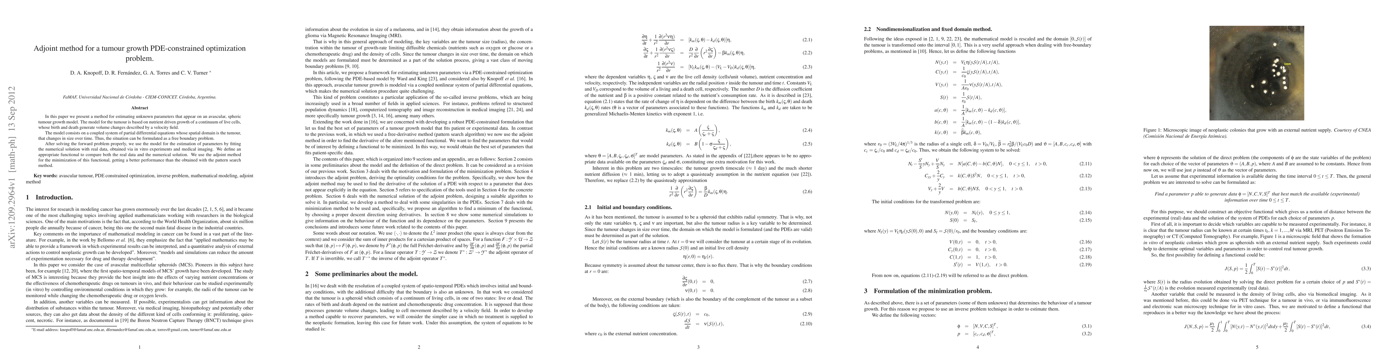 This paper proposes an adjoint method for estimating parameters in a PDE-constrained optimization problem modeling avascular tumour growth. The method fits a numerical solution to real data from experiments and imaging, achieving better performance than a pattern search method.