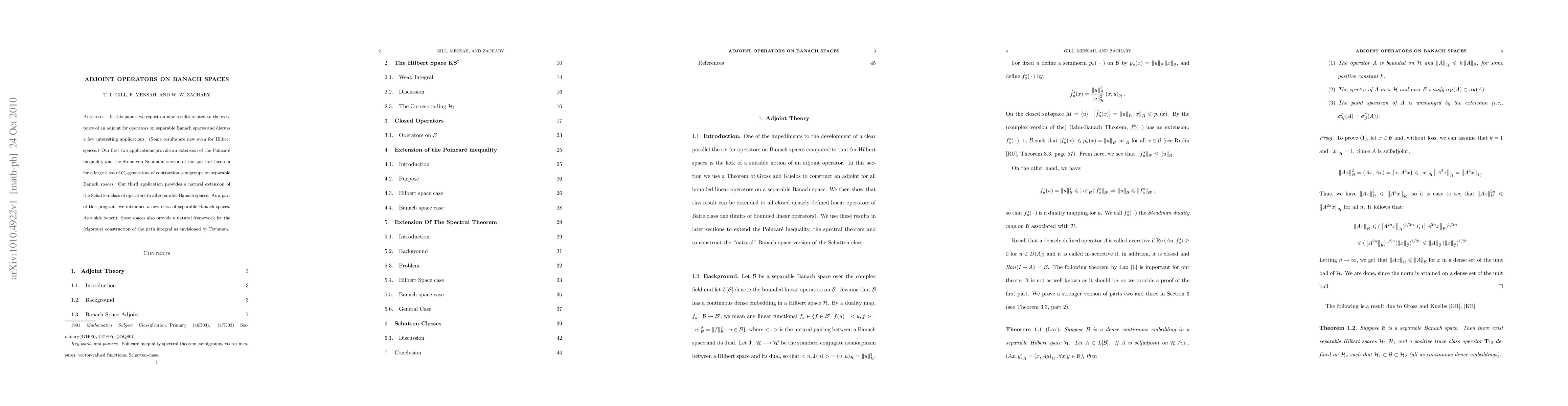 In this paper, we report on new results related to the existence of an adjoint for operators on separable Banach spaces and discuss a few interesting applications. (Some results are new even for Hilbert spaces.) Our first two applications provide an extension of the Poincar\'{e} inequality and the Stone-von Neumann version of the spectral theorem for a large class of $C_0$-generators of contraction semigroups on separable Banach spaces. Our third application provides a natural extension of the Schatten-class of operators to all separable Banach spaces. As a part of this program, we introduce a new class of separable Banach spaces. As a side benefit, these spaces also provide a natural framework for the (rigorous) construction of the path integral as envisioned by Feynman.