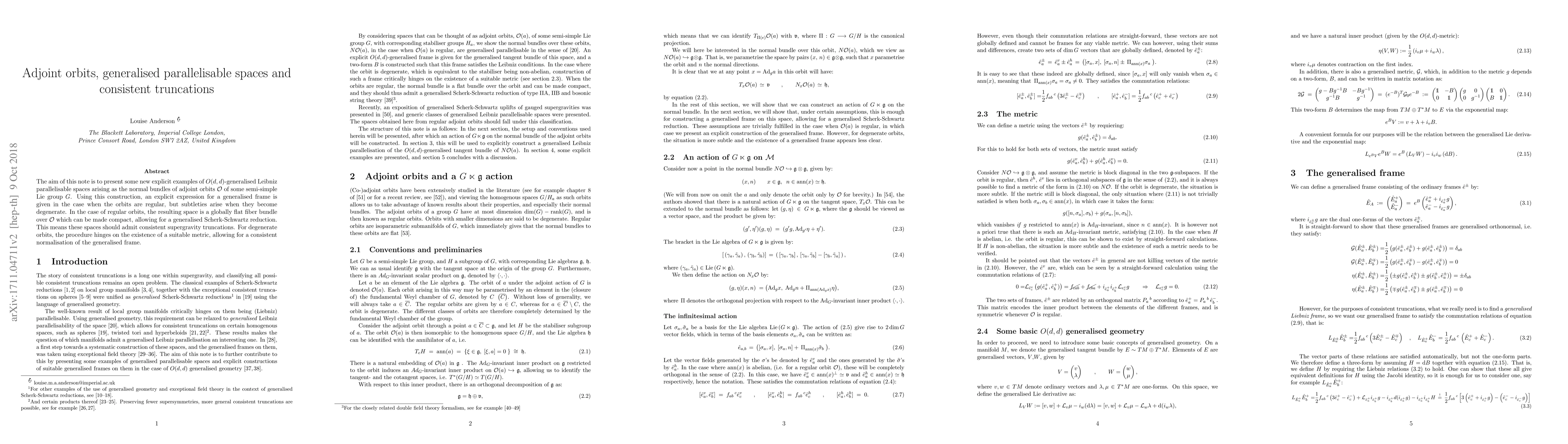 This paper presents new examples of $O(d,d)$-generalised Leibniz parallelisable spaces derived from the normal bundles of adjoint orbits of semi-simple Lie groups. It provides explicit expressions for generalised frames in regular orbits, leading to globally flat fiber bundles that can undergo Scherk-Schwartz reduction, suggesting consistent supergravity truncations. For degenerate orbits, it explores the role of suitable metrics for consistent normalisation of the generalised frame.