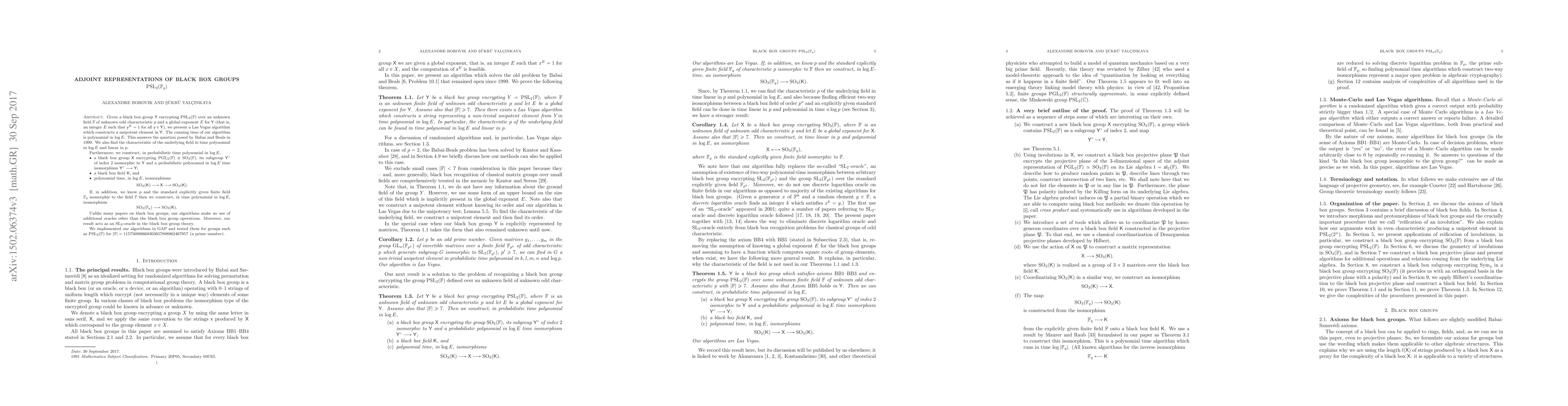 Given a black box group $\mathsf{Y}$ encrypting $\rm{PSL}_2(\mathbb{F})$ over an unknown field $\mathbb{F}$ of unknown odd characteristic $p$ and a global exponent $E$ for $\mathsf{Y}$ (that is, an integer $E$ such that $\mathsf{y}^E=1$ for all $\mathsf{y} \in \mathsf{Y}$), we present a Las Vegas algorithm which constructs a unipotent element in $\mathsf{Y}$. The running time of our algorithm is polynomial in $\log E$. This answers the question posed by Babai and Beals in 1999. We also find the characteristic of the underlying field in time polynomial in $\log E$ and linear in $p$. Furthermore, we construct, in probabilistic time polynomial in $\log E$, 1. a black box group $\mathsf{X}$ encrypting $\rm{PGL}_2(\mathbb{F}) \cong\rm{SO}_3(\mathbb{F})$, its subgroup $\mathsf{Y}^\circ$ of index $2$ isomorphic to $\mathsf{Y}$ and a probabilistic polynomial in $\log E$ time isomorphism $\mathsf{Y}^\circ \longrightarrow \mathsf{Y}$; 2. a black box field $\mathsf{K}$, and 3. polynomial time, in $\log E$, isomorphisms \[ \rm{SO}_3(\mathsf{K}) \longrightarrow \mathsf{X} \longrightarrow \rm{SO}_3(\mathsf{K}). \] If, in addition, we know $p$ and the standard explicitly given finite field $\mathbb{F}$ isomorphic to $\mathbb{F}$ then we construct, in time polynomial in $\log E$, isomorphism \[ \rm{SO}_3(\mathbb{F})\longrightarrow \rm{SO}_3(\mathsf{K}). \] Unlike many papers on black box groups, our algorithms make no use of additional oracles other than the black box group operations. Moreover, our result acts as an $\rm{SL}_2$-oracle in the black box group theory. We implemented our algorithms in GAP and tested them for groups such as $\rm{PSL}_2(\mathbb{F})$ for $|\mathbb{F}|=115756986668303657898962467957$ (a prime number).