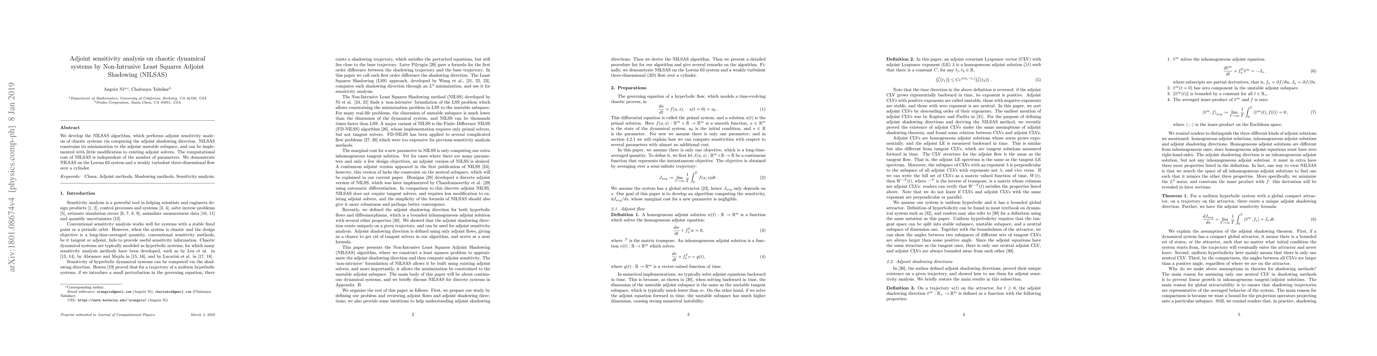 The NILSAS algorithm enables adjoint sensitivity analysis of chaotic dynamical systems by computing the adjoint shadowing direction, with minimal modification to existing adjoint solvers and independent computational cost. Demonstrated on the Lorenz 63 system and turbulent flow over a cylinder, NILSAS constrains its minimization to the adjoint unstable subspace.