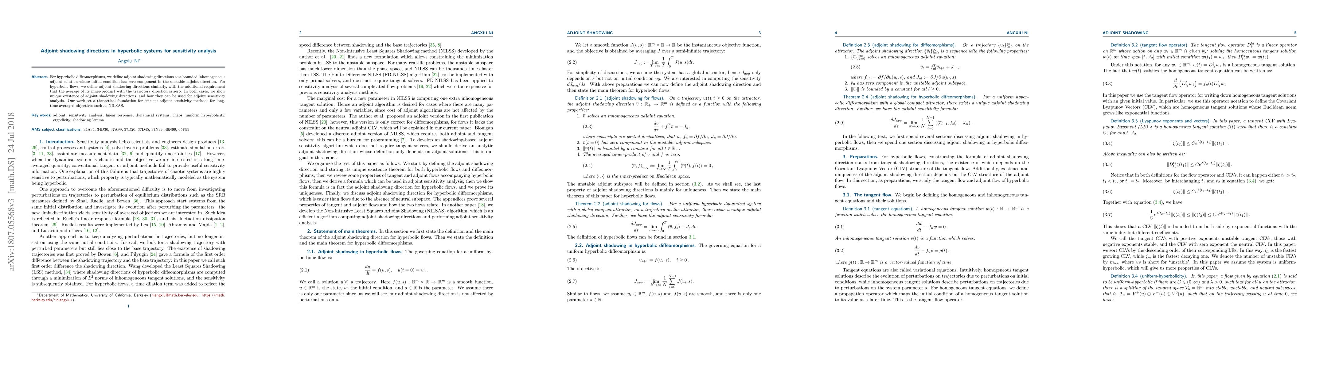 For hyperbolic diffeomorphisms, we define adjoint shadowing directions as a bounded inhomogeneous adjoint solution whose initial condition has zero component in the unstable adjoint direction. For hyperbolic flows, we define adjoint shadowing directions similarly, with the additional requirement that the average of its inner-product with the trajectory direction is zero. In both cases, we show unique existence of adjoint shadowing directions, and how they can be used for adjoint sensitivity analysis. Our work set a theoretical foundation for efficient adjoint sensitivity methods for long-time-averaged objectives such as NILSAS.