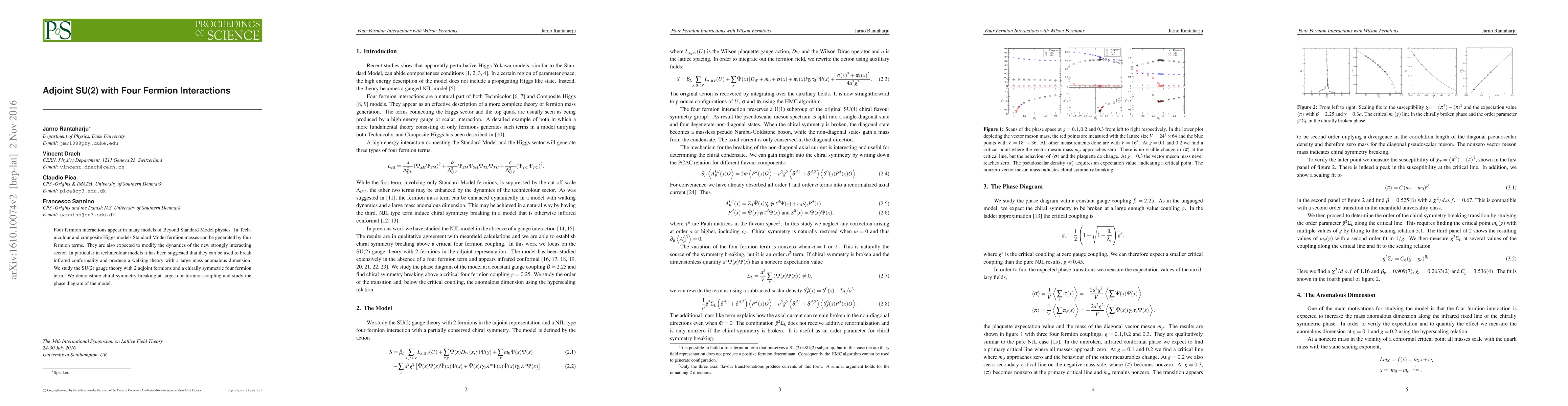 This paper investigates an SU(2) gauge theory with two adjoint fermions and a chirally symmetric four fermion interaction, demonstrating chiral symmetry breaking at strong coupling and exploring the model's phase diagram. The study aims to understand the implications of such interactions in generating fermion masses and modifying the dynamics of a new strongly interacting sector.