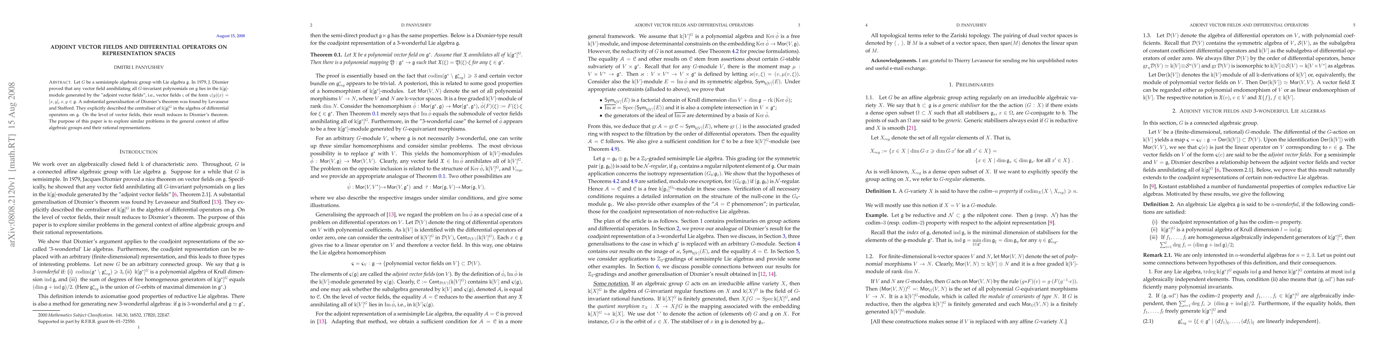 Let $G$ be a semisimple algebraic group with Lie algebra $\g$. In 1979, J. Dixmier proved that any vector field annihilating all $G$-invariant polynomials on $\g$ lies in the $\bbk[\g]$-module generated by the "adjoint vector fields", i.e., vector fields $\varsigma$ of the form $\varsigma(y)(x)=[x,y]$, $x,y\in\g$. A substantial generalisation of Dixmier's theorem was found by Levasseur and Stafford. They explicitly described the centraliser of $\bbk[\g]^G$ in the algebra of differential operators on $\g$. On the level of vector fields, their result reduces to Dixmier's theorem. The purpose of this paper is to explore similar problems in the general context of affine algebraic groups and their rational representations.