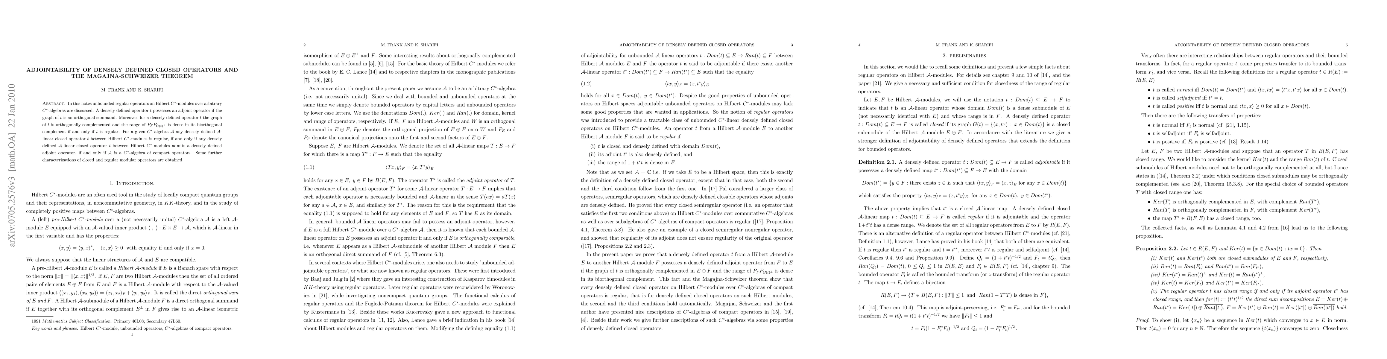 In this notes unbounded regular operators on Hilbert $C^*$-modules over arbitrary $C^*$-algebras are discussed. A densely defined operator $t$ possesses an adjoint operator if the graph of $t$ is an orthogonal summand. Moreover, for a densely defined operator $t$ the graph of $t$ is orthogonally complemented and the range of $P_FP_{G(t)^\bot}$ is dense in its biorthogonal complement if and only if $t$ is regular. For a given $C^*$-algebra $\mathcal A$ any densely defined $\mathcal A$-linear closed operator $t$ between Hilbert $C^*$-modules is regular, if and only if any densely defined $\mathcal A$-linear closed operator $t$ between Hilbert $C^*$-modules admits a densely defined adjoint operator, if and only if $\mathcal A$ is a $C^*$-algebra of compact operators. Some further characterizations of closed and regular modular operators are obtained. Changes 1: Improved results, corrected misprints, added references. Accepted by J. Operator Theory, August 2007 / Changes 2: Filled gap in the proof of Thm. 3.1, changes in the formulations of Cor. 3.2 and Thm. 3.4, updated references and address of the second author.