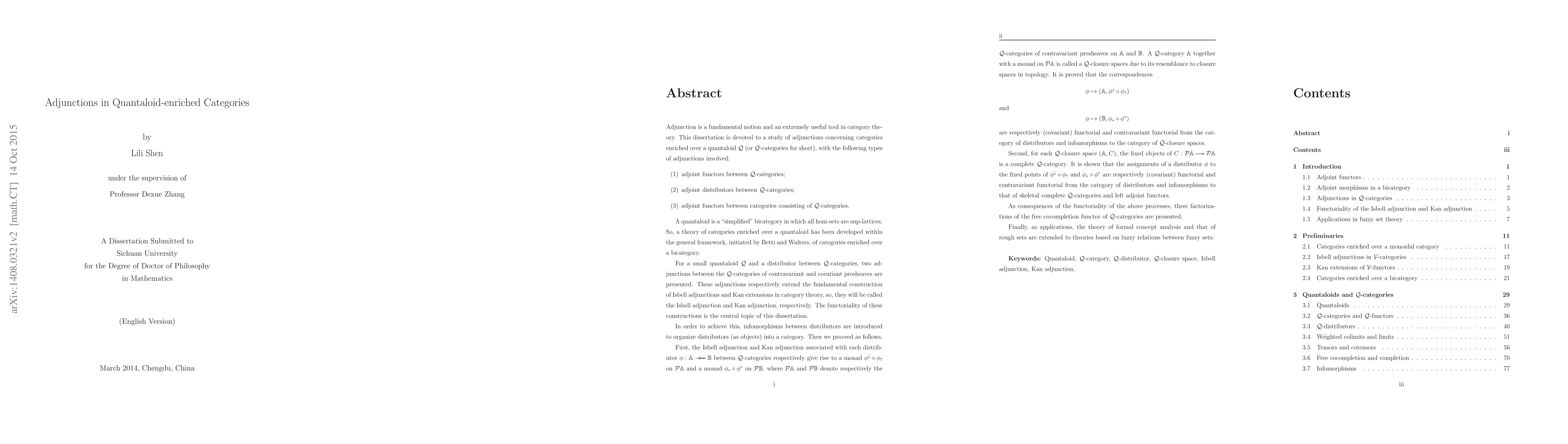 This dissertation is devoted to a study of adjunctions concerning categories enriched over a quantaloid Q (or Q-categories for short), with the following types of adjunctions involved: (1) adjoint functors between Q-categories; (2) adjoint distributors between Q-categories; (3) adjoint functors between categories consisting of Q-categories. For a small quantaloid Q and a distributor between Q-categories, two adjunctions between the Q-categories of contravariant and covariant presheaves are presented. These adjunctions respectively extend the fundamental construction of Isbell adjunctions and Kan extensions in category theory, so, they will be called the Isbell adjunction and Kan adjunction, respectively. The functoriality of these constructions is the central topic of this dissertation. In order to achieve this, infomorphisms between distributors are introduced to organize distributors (as objects) into a category. Then we proceed as follows: first, the Isbell adjunction and Kan adjunction associated with each distributor between Q-categories give rise to two monads, which are respectively (covariant) functorial and contravariant functorial from the category of distributors and infomorphisms to the category of Q-closure spaces; second, it is shown that the assignments of a distributor to the fixed points of the two monads are respectively (covariant) functorial and contravariant functorial from the category of distributors and infomorphisms to that of skeletal complete Q-categories and left adjoint functors. As consequences of the functoriality of the above processes, three factorizations of the free cocompletion functor of Q-categories are presented. Finally, as applications, the theory of formal concept analysis and that of rough sets are extended to theories based on fuzzy relations between fuzzy sets.