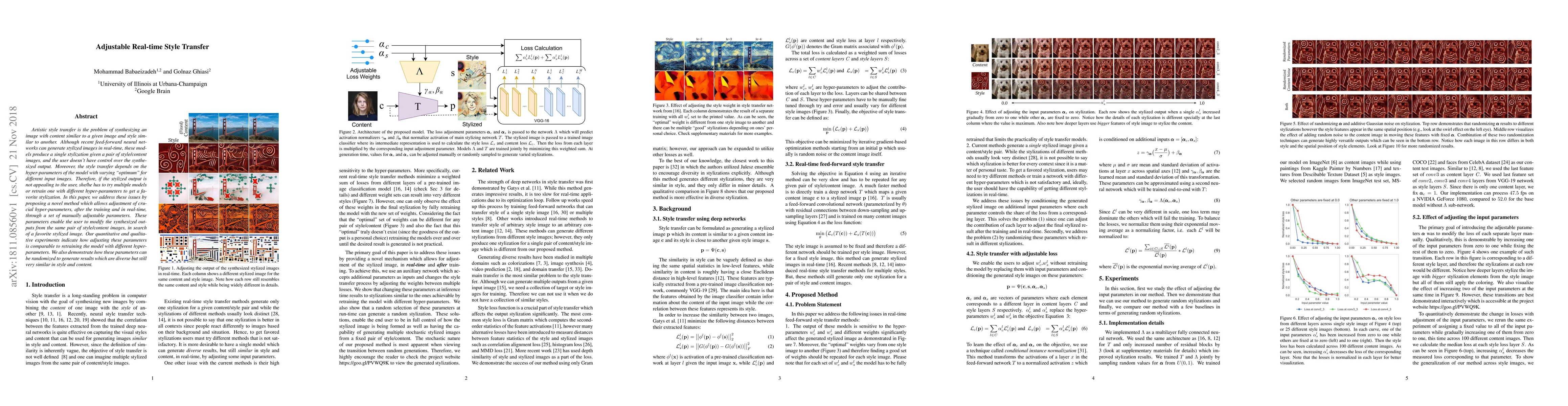 This paper proposes a method for real-time, adjustable style transfer that allows users to modify hyper-parameters post-training to achieve preferred stylizations without retraining. The approach enables diverse yet consistent results by adjusting manually set parameters.
