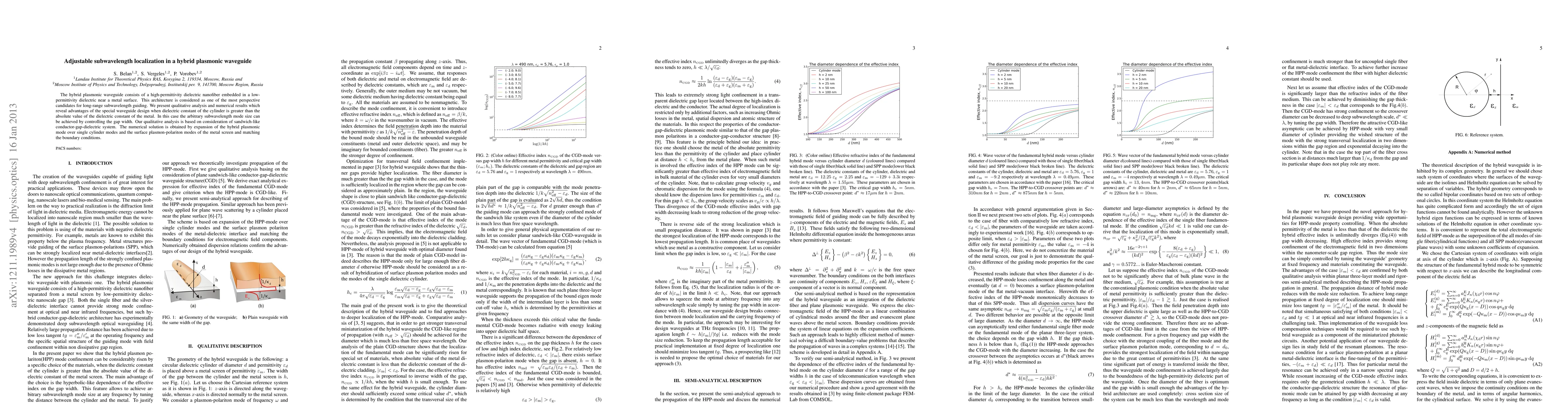 This paper investigates a hybrid plasmonic waveguide consisting of a high-permittivity dielectric nanofiber embedded in a low-permittivity dielectric near a metal surface, demonstrating adjustable subwavelength localization by controlling the gap width when the dielectric constant of the cylinder exceeds the absolute value of the metal's dielectric constant. The study uses a qualitative analysis and numerical simulations to show the advantages of this waveguide design.