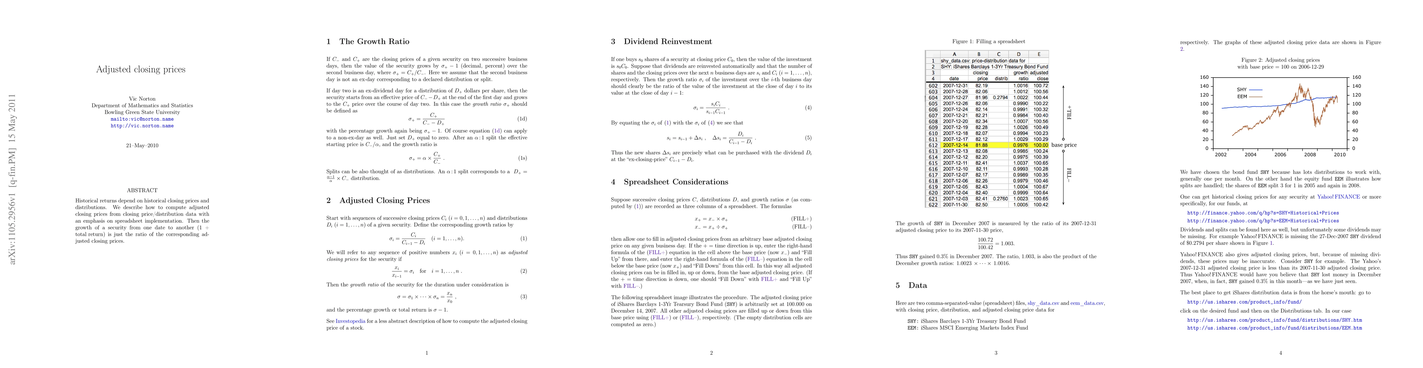 Summary: This paper explains how to calculate adjusted closing prices using historical data and spreadsheets, emphasizing the method's implementation. It concludes that the growth of a security over time is represented by the ratio of its corresponding adjusted closing prices.