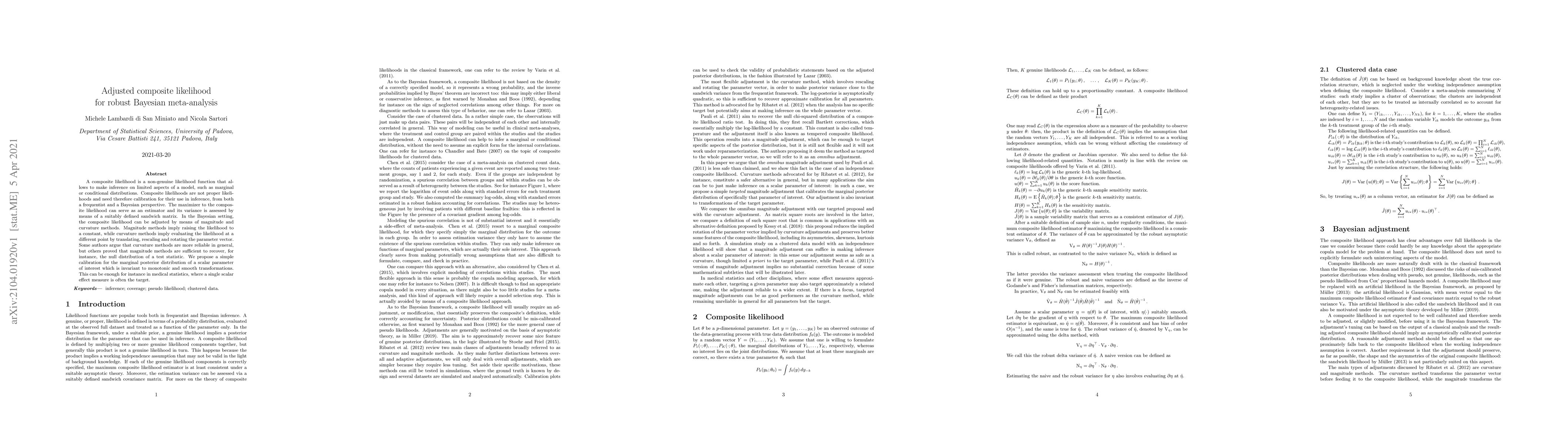 This paper proposes a calibration method to adjust composite likelihood for robust Bayesian meta-analysis, focusing on a simple, transformation-invariant method for estimating a single scalar parameter of interest. The method aims to improve inference in scenarios where traditional likelihood approaches may be insufficient.