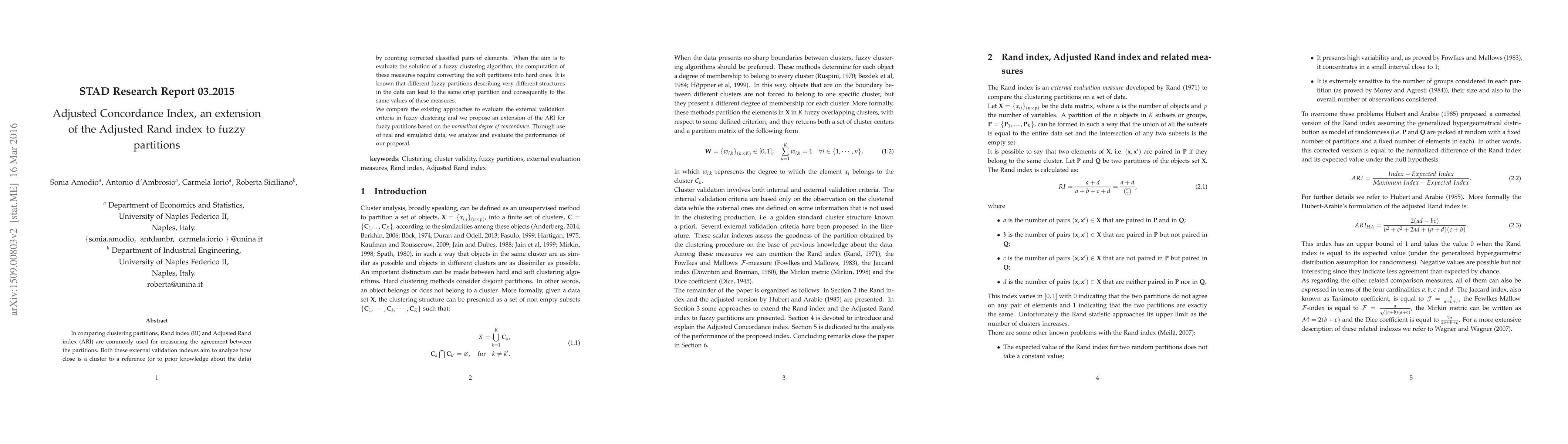 In comparing clustering partitions, Rand index (RI) and Adjusted Rand index (ARI) are commonly used for measuring the agreement between the partitions. Both these external validation indexes aim to analyze how close is a cluster to a reference (or to prior knowledge about the data) by counting corrected classified pairs of elements. When the aim is to evaluate the solution of a fuzzy clustering algorithm, the computation of these measures require converting the soft partitions into hard ones. It is known that different fuzzy partitions describing very different structures in the data can lead to the same crisp partition and consequently to the same values of these measures. We compare the existing approaches to evaluate the external validation criteria in fuzzy clustering and we propose an extension of the ARI for fuzzy partitions based on the normalized degree of concordance. Through use of real and simulated data, we analyze and evaluate the performance of our proposal.