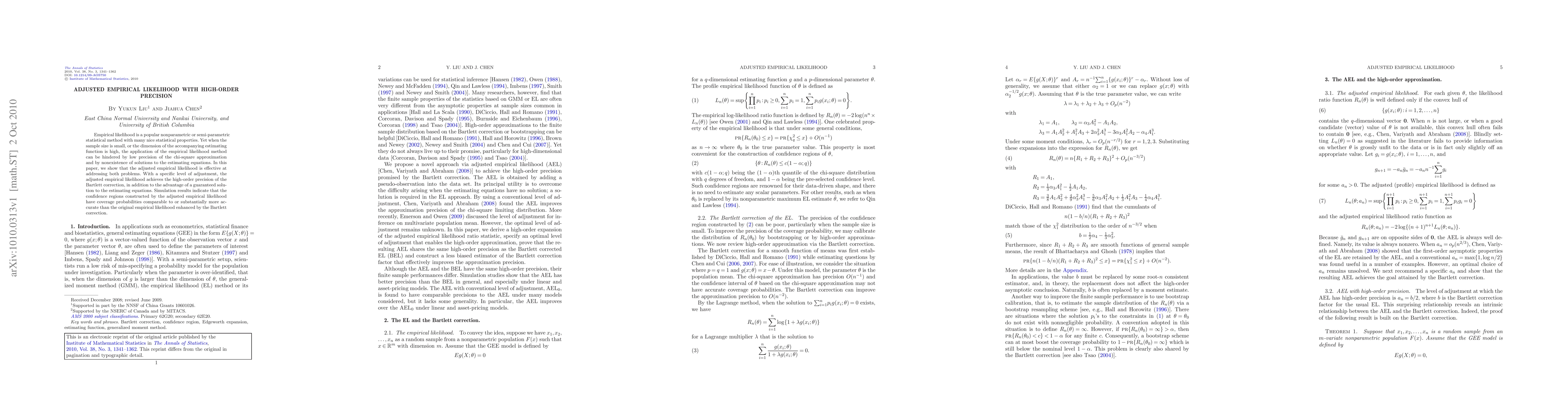 This paper proposes an adjusted empirical likelihood method to improve the precision of statistical inference, particularly in scenarios with small sample sizes or high dimensions. The adjusted empirical likelihood achieves high-order precision akin to Bartlett correction while ensuring the existence of solutions to estimating equations, outperforming the original empirical likelihood in simulations.