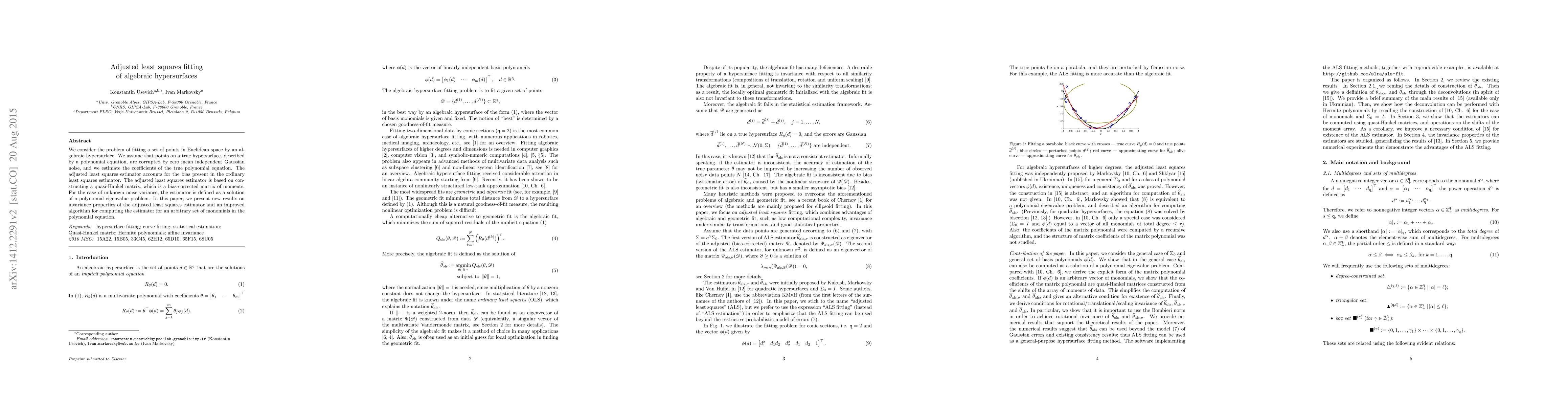 This paper proposes an adjusted least squares method for fitting algebraic hypersurfaces to noisy data points, correcting bias in ordinary least squares. It introduces a quasi-Hankel matrix and a polynomial eigenvalue problem for cases with unknown noise variance, presenting new results on invariance properties and an improved algorithm for computing the estimator.