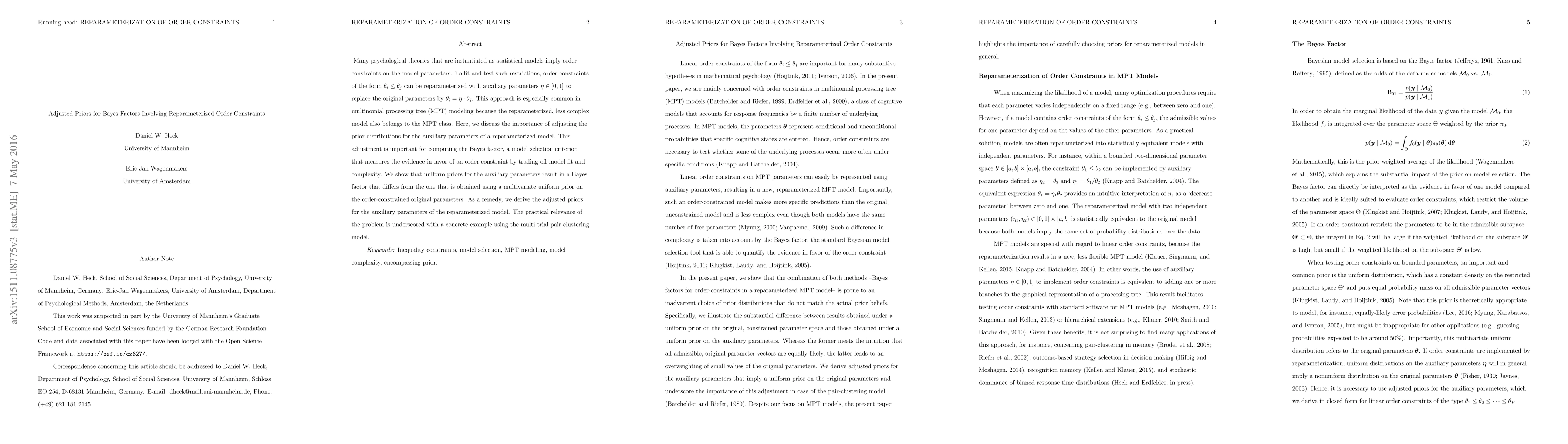 Many psychological theories that are instantiated as statistical models imply order constraints on the model parameters. To fit and test such restrictions, order constraints of the form $\theta_i \leq \theta_j$ can be reparameterized with auxiliary parameters $\eta\in [0,1]$ to replace the original parameters by $\theta_i = \eta\cdot\theta_j$. This approach is especially common in multinomial processing tree (MPT) modeling because the reparameterized, less complex model also belongs to the MPT class. Here, we discuss the importance of adjusting the prior distributions for the auxiliary parameters of a reparameterized model. This adjustment is important for computing the Bayes factor, a model selection criterion that measures the evidence in favor of an order constraint by trading off model fit and complexity. We show that uniform priors for the auxiliary parameters result in a Bayes factor that differs from the one that is obtained using a multivariate uniform prior on the order-constrained original parameters. As a remedy, we derive the adjusted priors for the auxiliary parameters of the reparameterized model. The practical relevance of the problem is underscored with a concrete example using the multi-trial pair-clustering model.