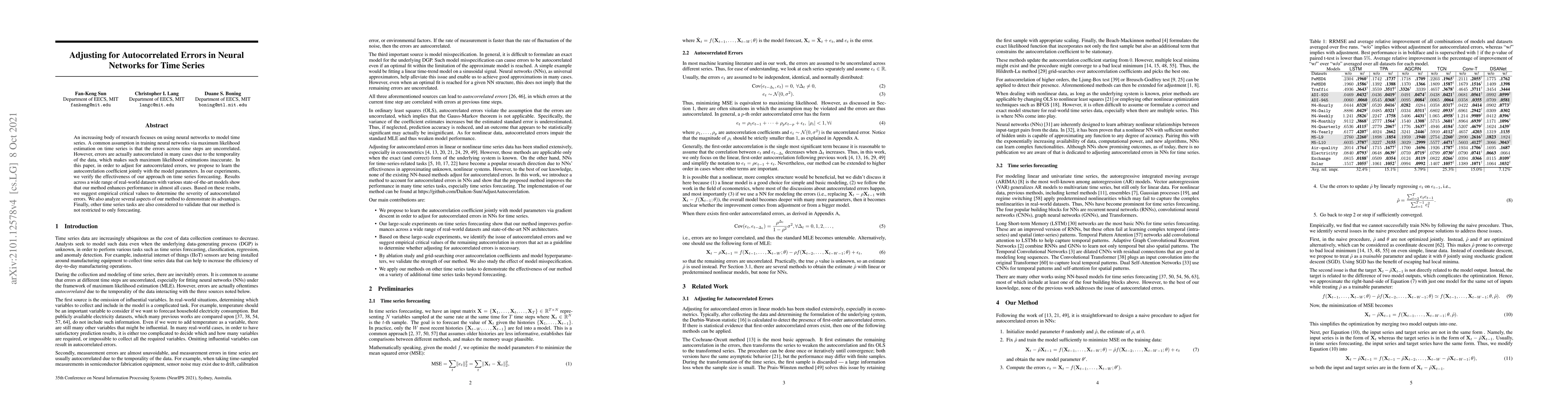 An increasing body of research focuses on using neural networks to model time series. A common assumption in training neural networks via maximum likelihood estimation on time series is that the errors across time steps are uncorrelated. However, errors are actually autocorrelated in many cases due to the temporality of the data, which makes such maximum likelihood estimations inaccurate. In this paper, in order to adjust for autocorrelated errors, we propose to learn the autocorrelation coefficient jointly with the model parameters. In our experiments, we verify the effectiveness of our approach on time series forecasting. Results across a wide range of real-world datasets with various state-of-the-art models show that our method enhances performance in almost all cases. Based on these results, we suggest empirical critical values to determine the severity of autocorrelated errors. We also analyze several aspects of our method to demonstrate its advantages. Finally, other time series tasks are also considered to validate that our method is not restricted to only forecasting.