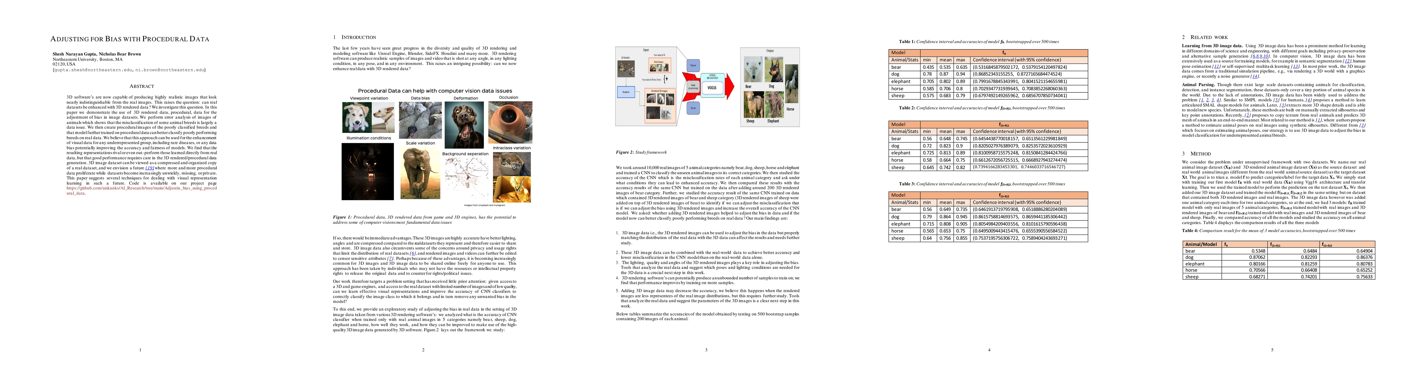 3D softwares are now capable of producing highly realistic images that look nearly indistinguishable from the real images. This raises the question: can real datasets be enhanced with 3D rendered data? We investigate this question. In this paper we demonstrate the use of 3D rendered data, procedural, data for the adjustment of bias in image datasets. We perform error analysis of images of animals which shows that the misclassification of some animal breeds is largely a data issue. We then create procedural images of the poorly classified breeds and that model further trained on procedural data can better classify poorly performing breeds on real data. We believe that this approach can be used for the enhancement of visual data for any underrepresented group, including rare diseases, or any data bias potentially improving the accuracy and fairness of models. We find that the resulting representations rival or even out-perform those learned directly from real data, but that good performance requires care in the 3D rendered procedural data generation. 3D image dataset can be viewed as a compressed and organized copy of a real dataset, and we envision a future where more and more procedural data proliferate while datasets become increasingly unwieldy, missing, or private. This paper suggests several techniques for dealing with visual representation learning in such a future.
