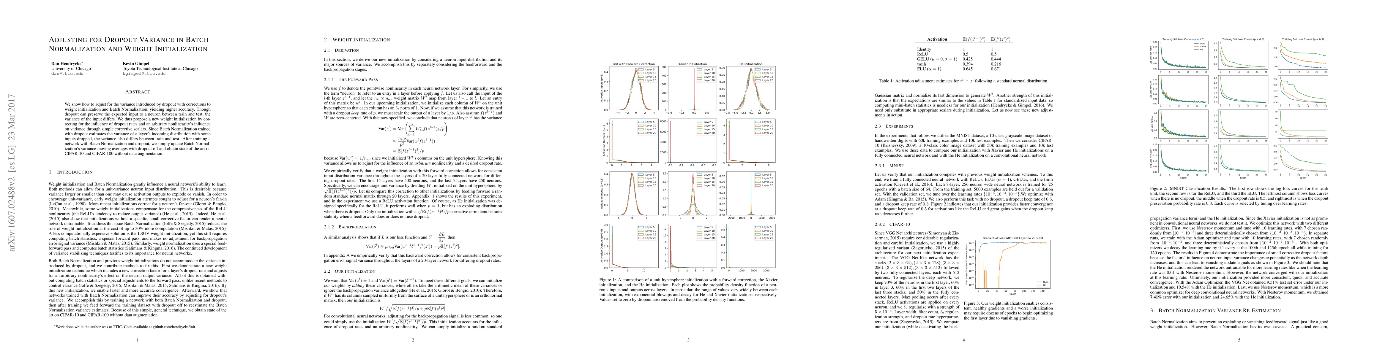 This paper proposes adjustments to weight initialization and Batch Normalization to correct for dropout-induced variance, leading to higher accuracy. It introduces a new weight initialization method and modifies Batch Normalization to better estimate variance, achieving state-of-the-art results on CIFAR-10 and CIFAR-100 without data augmentation.