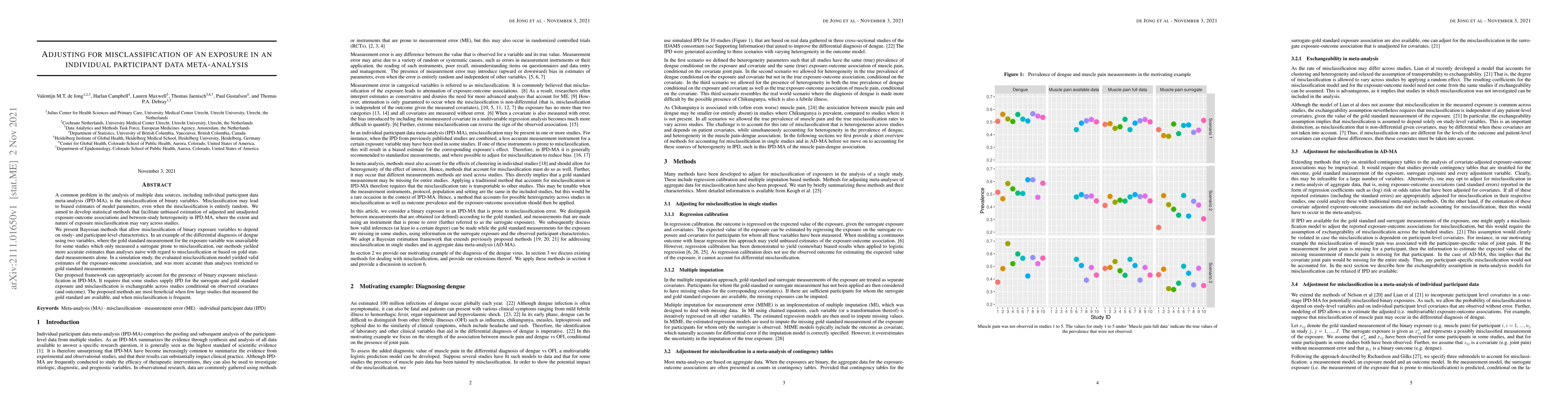 This paper develops Bayesian methods to adjust for misclassification of binary exposure variables in individual participant data meta-analysis (IPD-MA), providing more accurate estimates of exposure-outcome associations and between-study heterogeneity. The methods are shown to be effective in a simulation study and an example involving dengue diagnosis, outperforming naive analyses and those based solely on gold standard measurements.