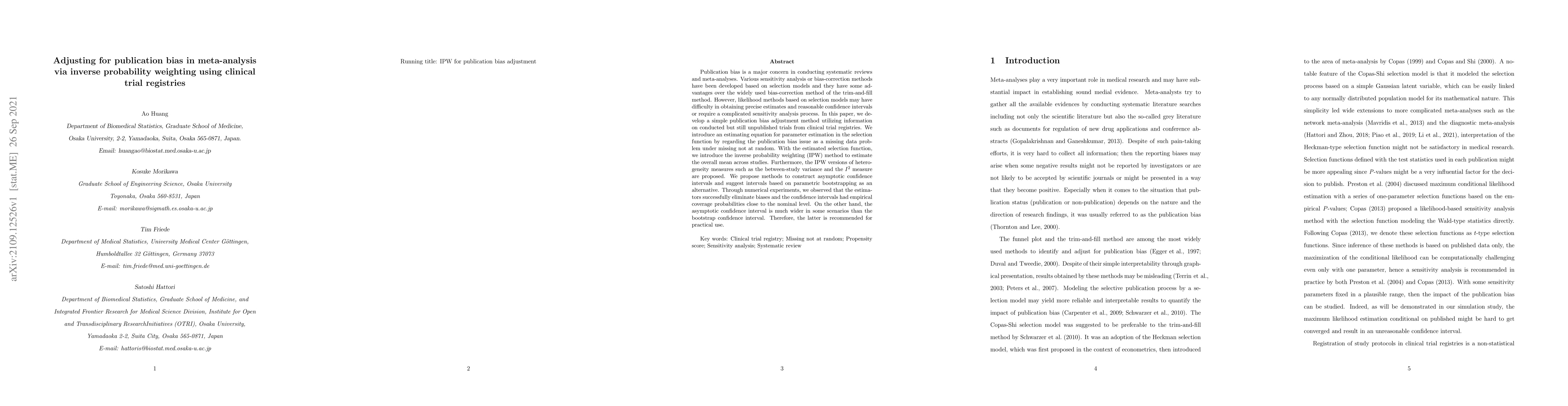 This paper proposes a new method for adjusting publication bias in meta-analysis using inverse probability weighting (IPW) based on clinical trial registry data. The authors develop an estimating equation for the selection function and suggest IPW versions of heterogeneity measures, recommending bootstrap confidence intervals for practical use due to their better empirical coverage.
