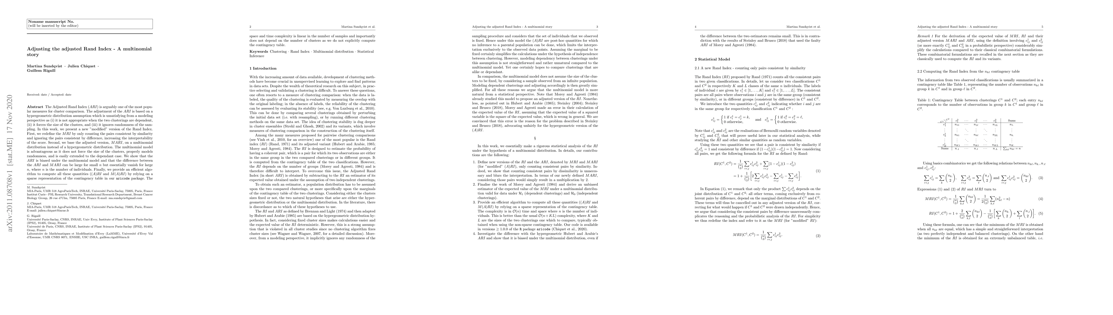The Adjusted Rand Index ($ARI$) is arguably one of the most popular measures for cluster comparison. The adjustment of the $ARI$ is based on a hypergeometric distribution assumption which is unsatisfying from a modeling perspective as (i) it is not appropriate when the two clusterings are dependent, (ii) it forces the size of the clusters, and (iii) it ignores randomness of the sampling. In this work, we present a new "modified" version of the Rand Index. First, we redefine the $MRI$ by only counting the pairs consistent by similarity and ignoring the pairs consistent by difference, increasing the interpretability of the score. Second, we base the adjusted version, $MARI$, on a multinomial distribution instead of a hypergeometric distribution. The multinomial model is advantageous as it does not force the size of the clusters, properly models randomness, and is easily extended to the dependant case. We show that the $ARI$ is biased under the multinomial model and that the difference between the $ARI$ and $MARI$ can be large for small $n$ but essentially vanish for large $n$, where $n$ is the number of individuals. Finally, we provide an efficient algorithm to compute all these quantities ($(A)RI$ and $M(A)RI$) by relying on a sparse representation of the contingency table in our \texttt{aricode} package. The space and time complexity is linear in the number of samples and importantly does not depend on the number of clusters as we do not explicitly compute the contingency table.