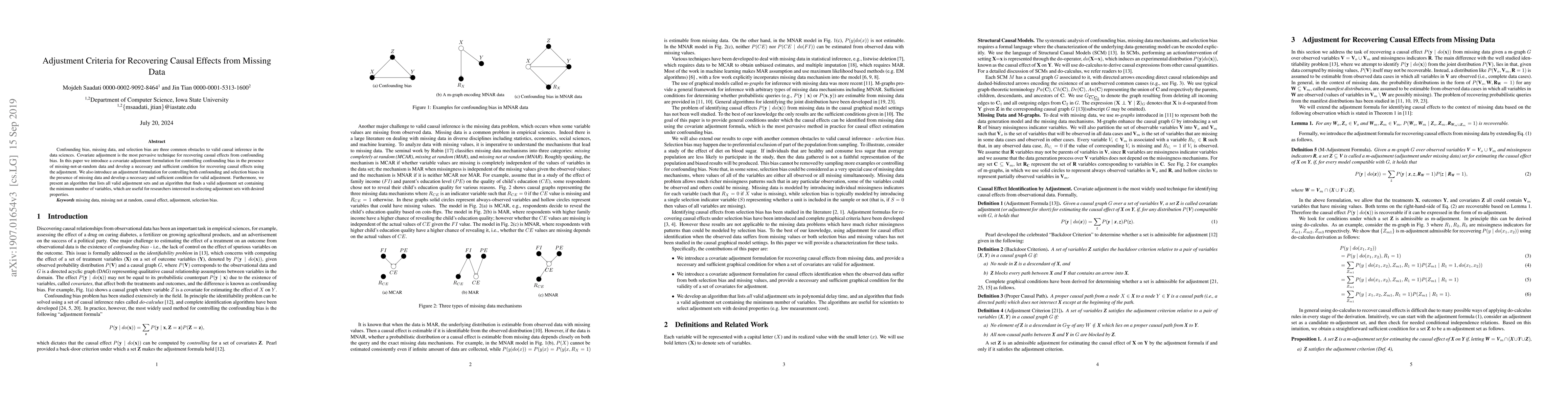 This paper proposes methods for adjusting confounding and selection biases in causal inference when dealing with missing-not-at-random data. It introduces necessary and sufficient conditions for recovering causal effects and provides algorithms to identify optimal adjustment sets.