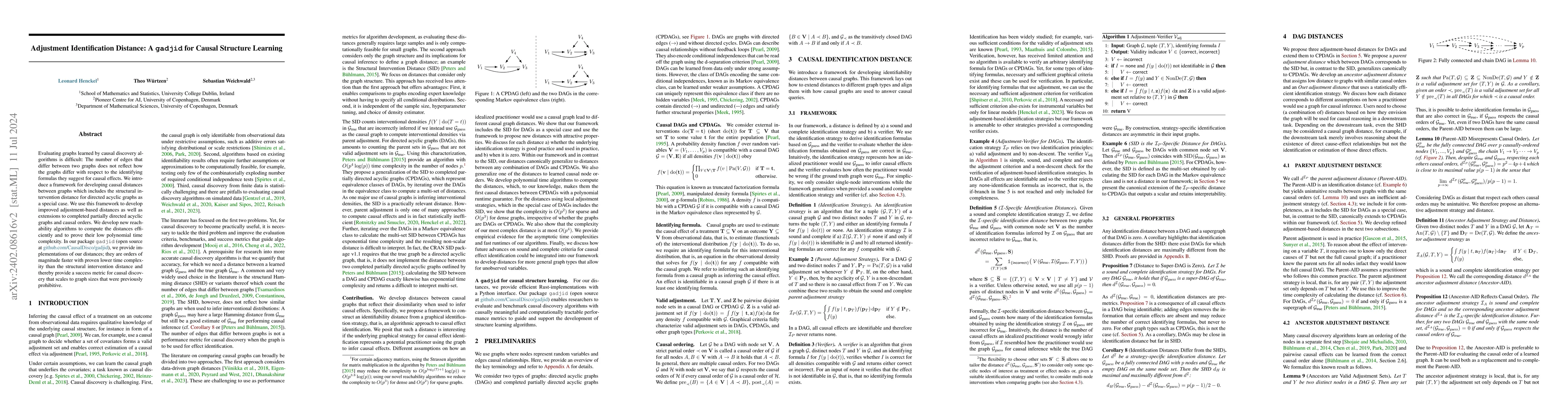 This paper introduces a new framework for measuring causal distances between graphs, specifically focusing on adjustment-based distances. The proposed gadjid metric is orders of magnitude faster and has lower time complexity compared to existing methods, enabling scalable evaluation of causal discovery algorithms.