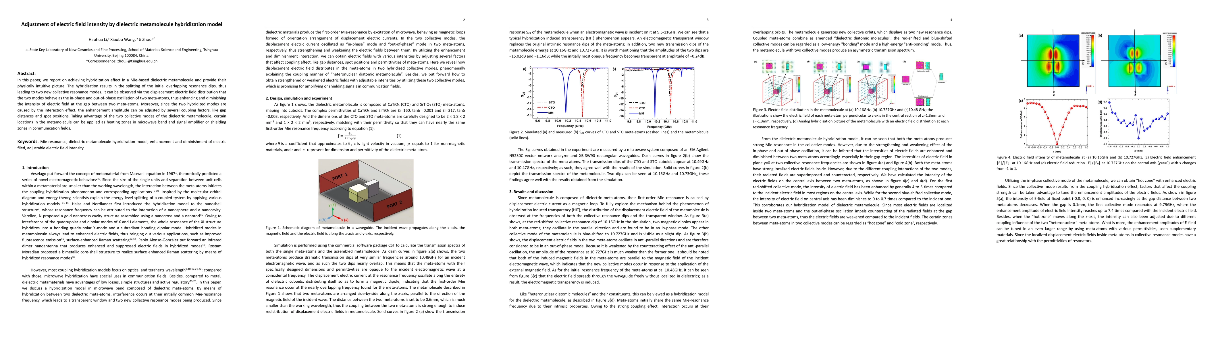 This paper explores the hybridization effect in Mie-based dielectric metamolecules, resulting in new collective resonance modes that enhance or diminish electric field intensity. The adjustable enhancement is influenced by coupling factors like gap distances and spot positions, enabling applications in microwave heating and communication signal amplification or shielding.