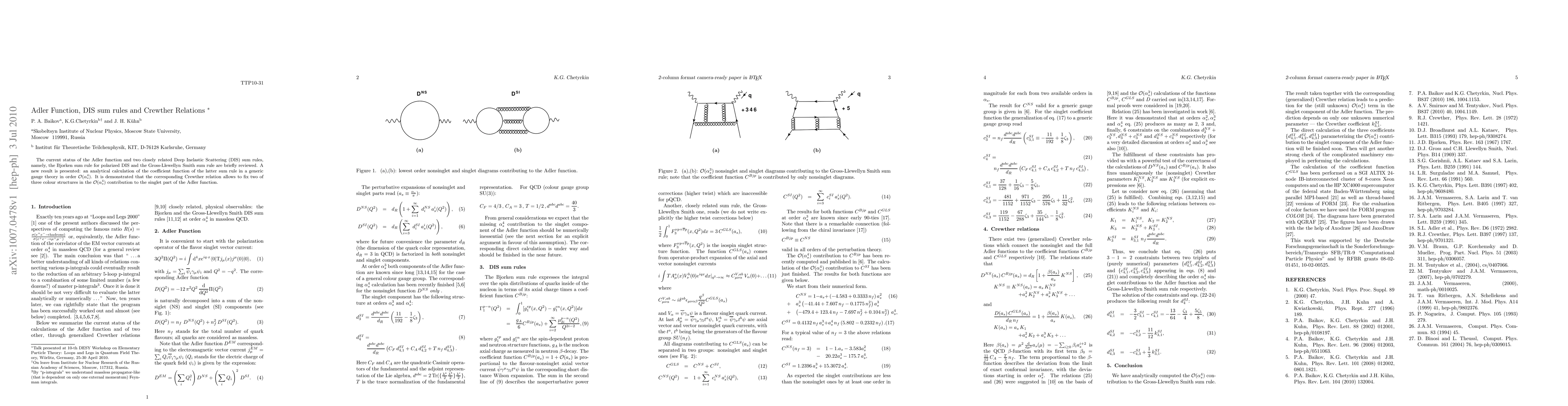 This paper reviews the Adler function and two DIS sum rules, presenting a new analytical calculation of the coefficient function for the Gross-Llewellyn Smith sum rule up to O(alpha_s^4). The Crewther relation derived from this work fixes two of three color structures in the O(alpha_s^4) contribution to the singlet part of the Adler function.