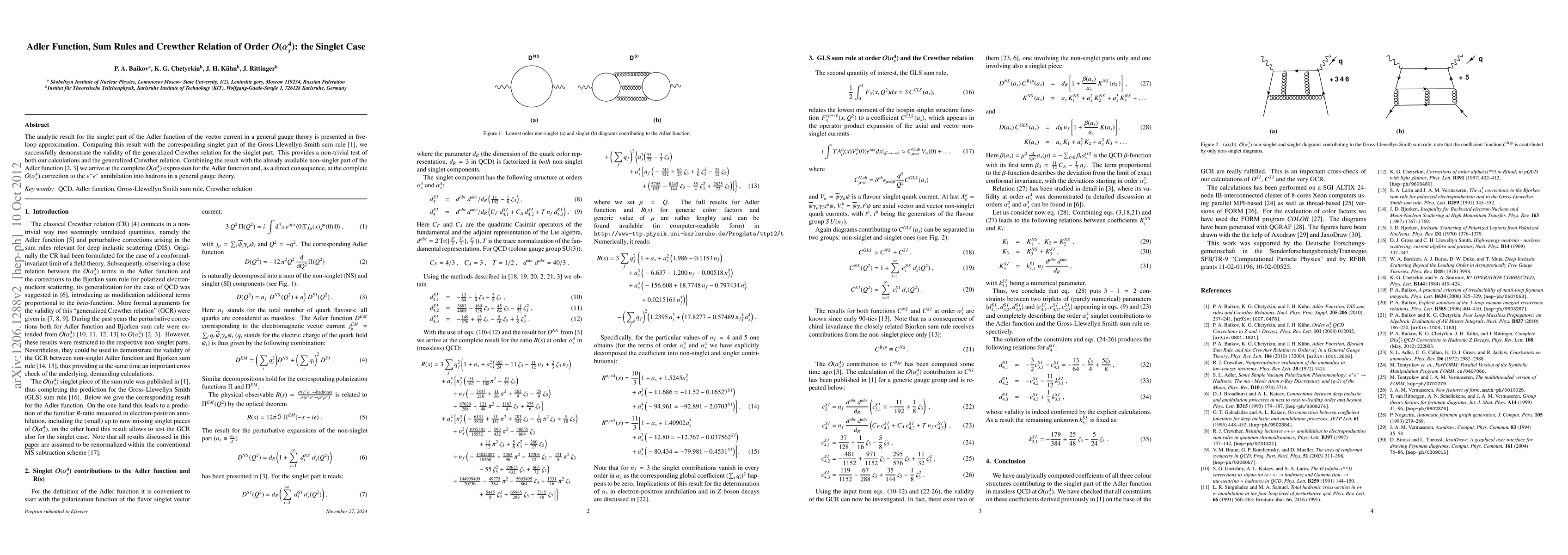 This paper provides the five-loop approximation for the singlet part of the Adler function in a general gauge theory, confirming the validity of the generalized Crewther relation. It also completes the ${\cal O}(\alpha_s^4)$ expression for the Adler function and the corresponding correction to $e^+ e^-$ annihilation into hadrons.